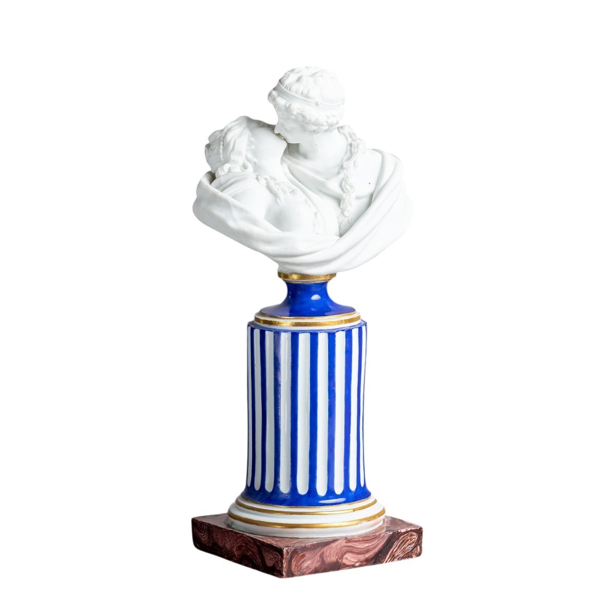 Rare modèle du Baiser, d'après Jean-Antoine Houdon, en biscuit, par la manufacture de porcelaine de Niderviller. Il repose sur un socle en colonne à piédouches. Étonnant décor de faux marbre et liserés de dorure.