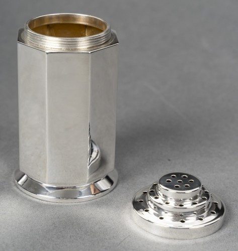 Saupoudroir en argent massif de forme octogonale sur une base à doucine facettée, le corps à huit pans coupés est uni, l’intérieur est en vermeil. Le couvercle vissé est perforé sur trois niveaux. L' envers présente une gravure de trois femmes dénudées.