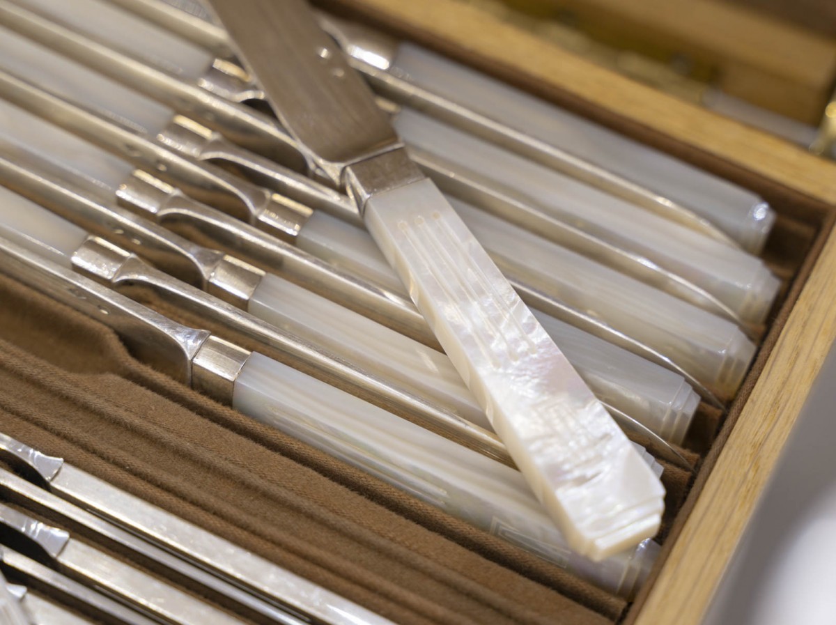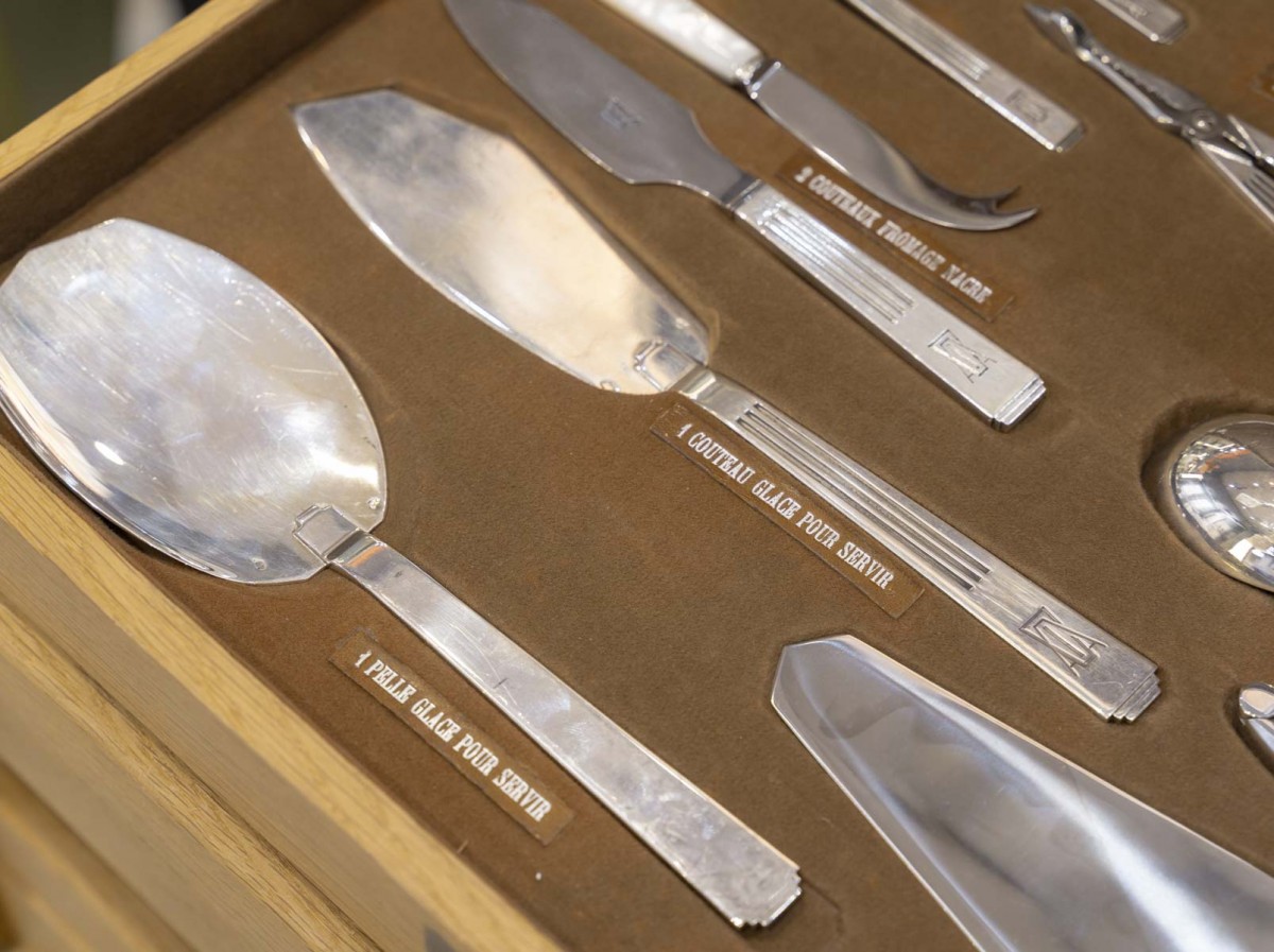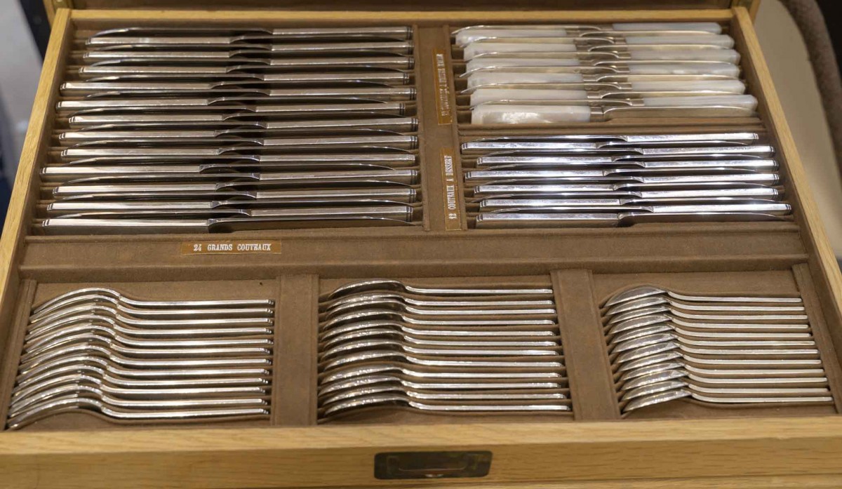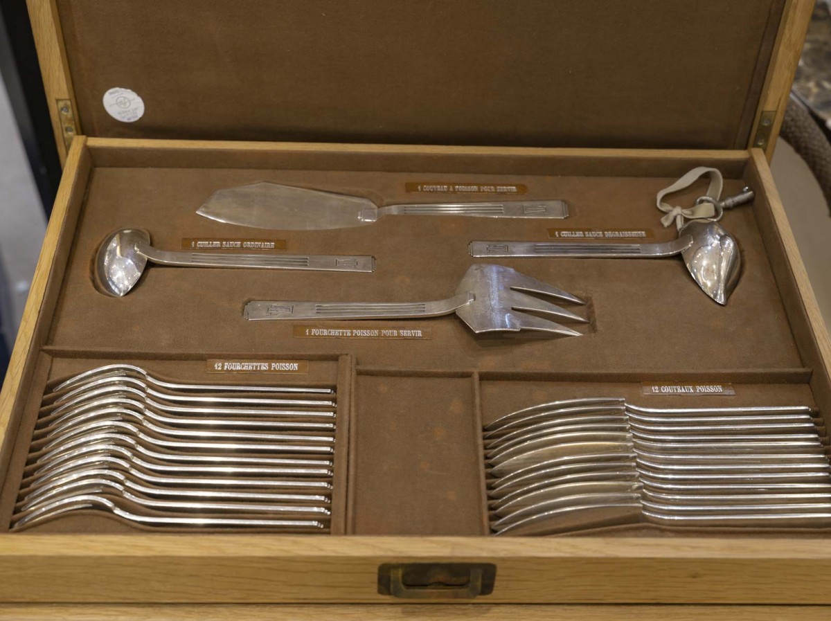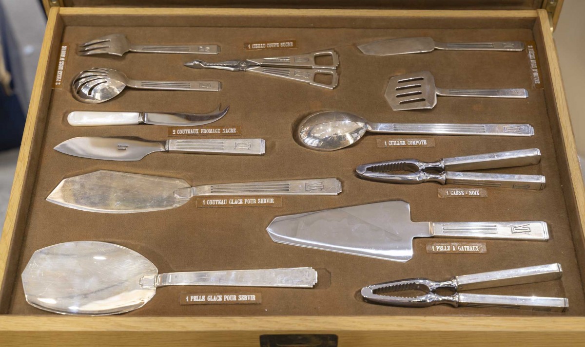 12 fourchettes à poisson, 12 couteaux à poisson, 24 grands couteaux manche argent fourré, 12 couteaux à dessert, 12 couteaux à fruits lame argent et manche en nacre, 12 fourchettes à gâteau, 12 cuillères à glace, 12 cuillères à thé-café, 24 grandes fourchettes, 12 grandes cuillères, 12 cuillères à dessert, 12 fourchettes à dessert,