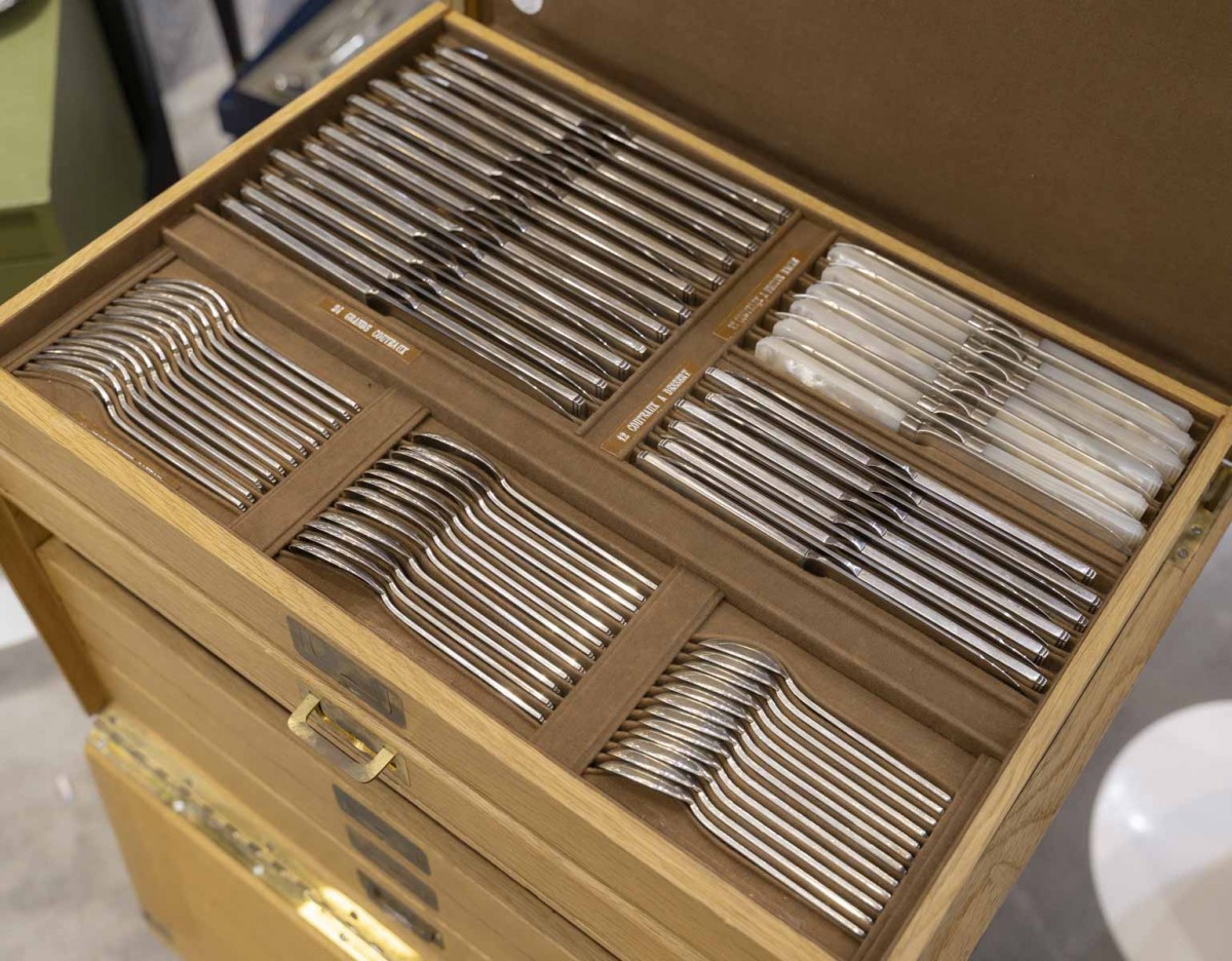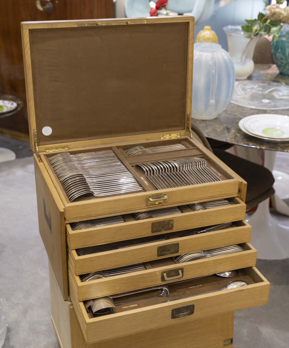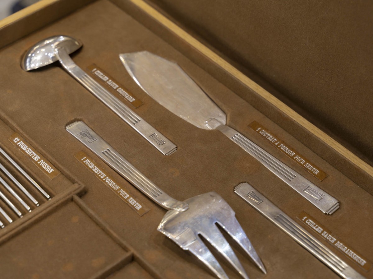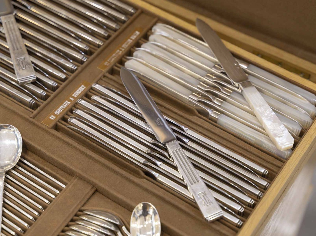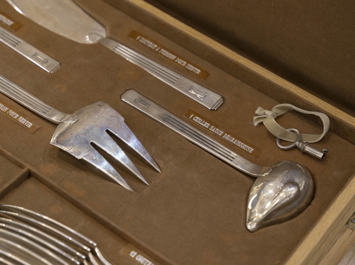 12 fourchettes à poisson, 12 couteaux à poisson, 24 grands couteaux manche argent fourré, 12 couteaux à dessert, 12 couteaux à fruits lame argent et manche en nacre, 12 fourchettes à gâteau, 12 cuillères à glace, 12 cuillères à thé-café, 24 grandes fourchettes, 12 grandes cuillères, 12 cuillères à dessert, 12 fourchettes à dessert,