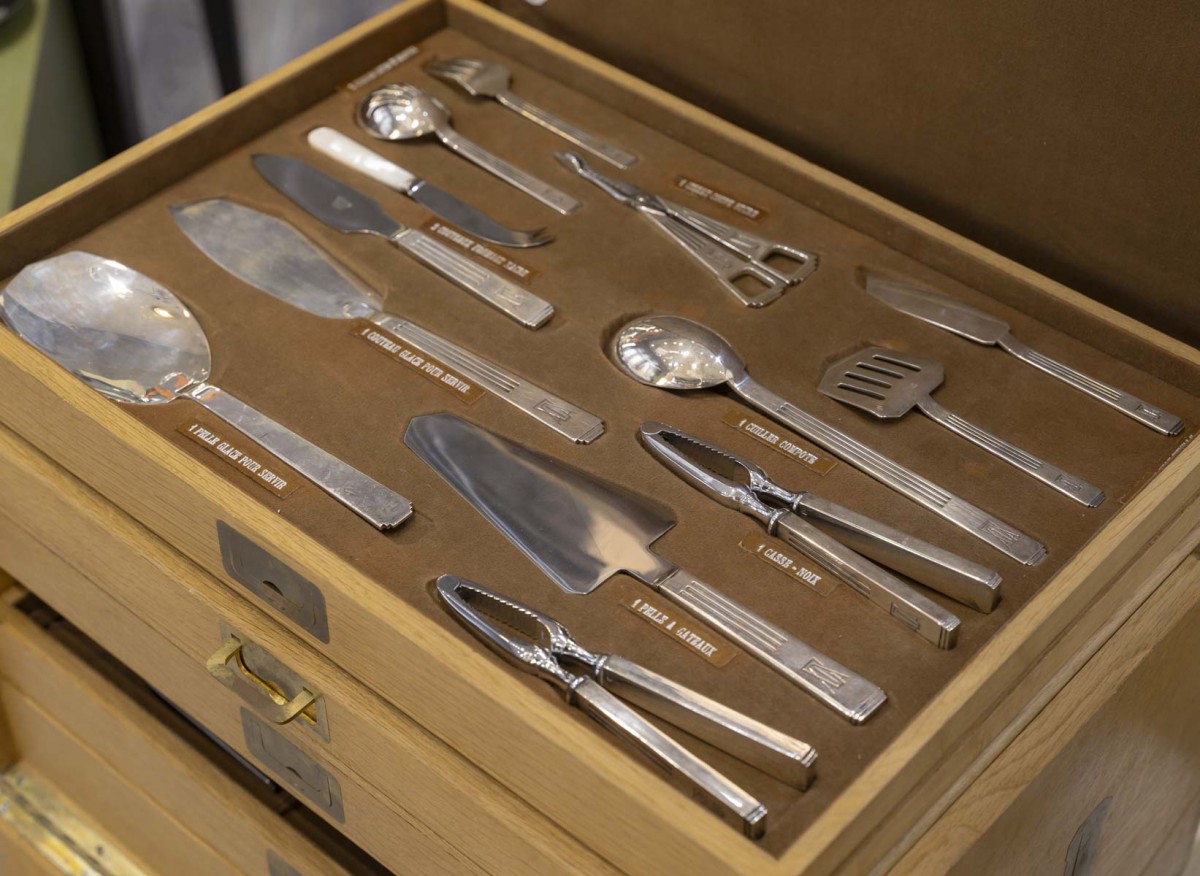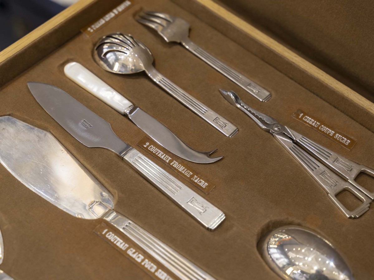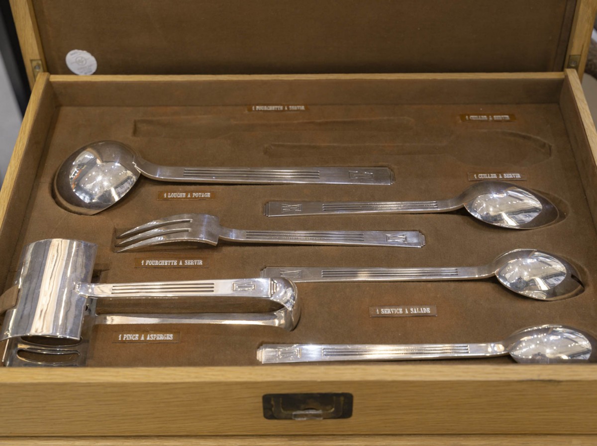 4 pièces à hors d’œuvre, 1 ciseau coupe-sucre, 2 couteaux à fromage, dont 1 manche nacre et lame métal, 1 cuillère à compote, 1 couteau à glace pour servir, 2 casse-noix, 1 pelle à glace pour servir, 1 pelle à gâteau manche argent fourré, 1 couteau à poisson pour servir, 1 cuillère à sauce ordinaire, 1 cuillère à sauce dégraisseuse, 1 fourchette à poisson pour servir, 1 fourchette à servir, 1 cuillère à servir, 1 louche à potage, 1 couvert à salade (2), 1 pince à asperges