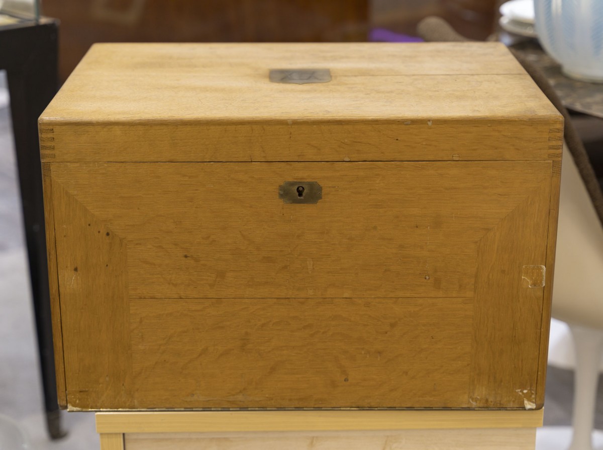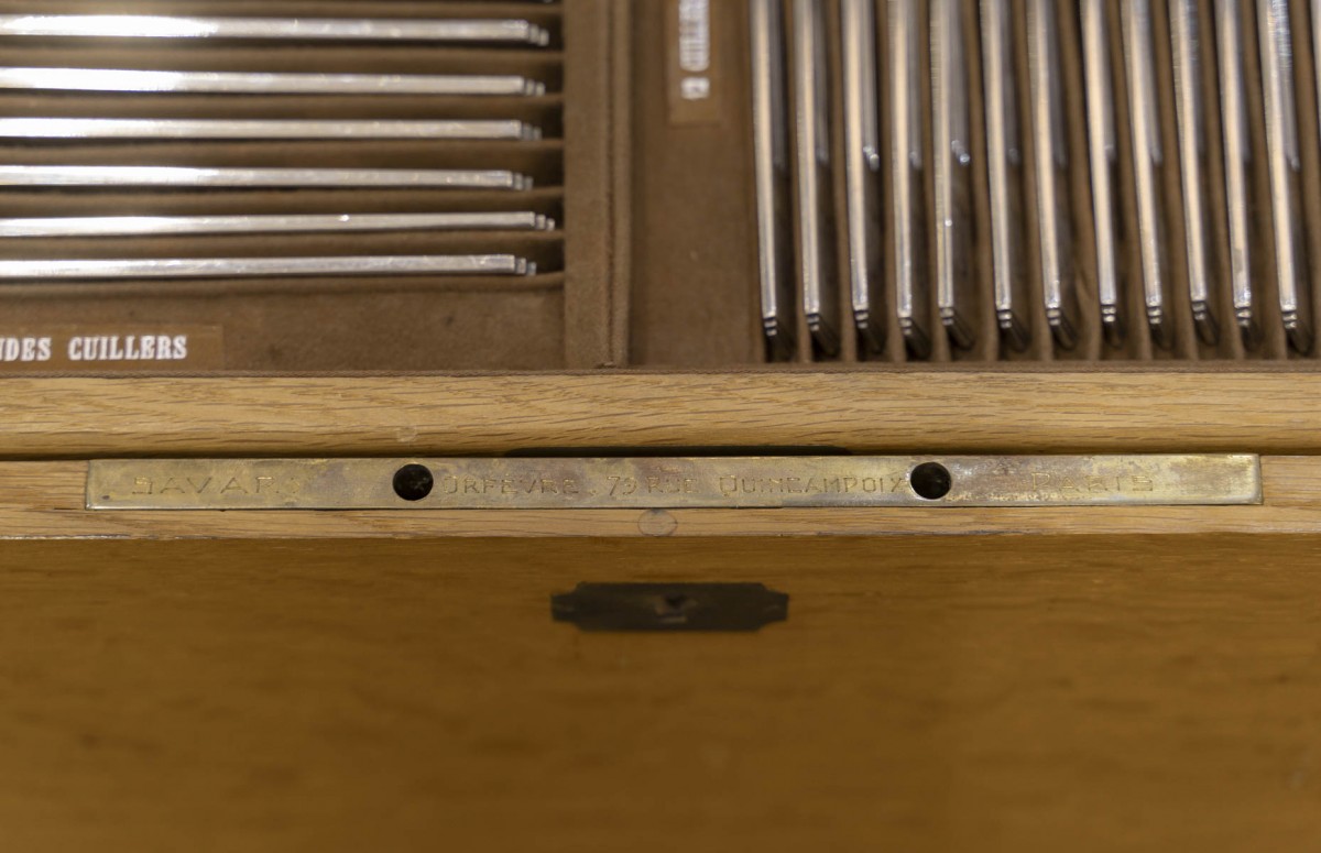 Présentée dans son coffret d'origine en chêne avec un monogramme en cuivre sur le couvercle. Poinçon du maître orfèvre et signature sur la serrure « Savary Orfèvre - 79 Rue Quincampoix Paris ».