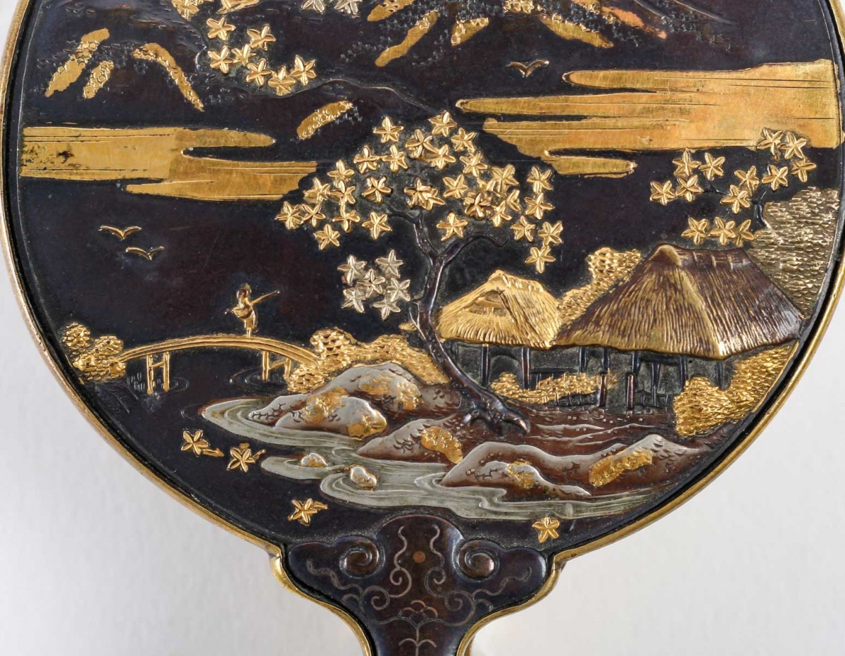 Très raffinée boîte en métal, décorée avec des incrustations en hirazogan et takazogan or et argent sur fond noir, de pagodes dans un paysage montagneux, de chaumières et pont près d'une rivière en shibuishi qui ondule. Les côtés sont rehaussés de bouquets fleuris, crabe et escargot. La signature de Ryumin est incrustée dans un cartouche en métal argenté. Dimensions : 7,2 x 6 x 2,5 cm.