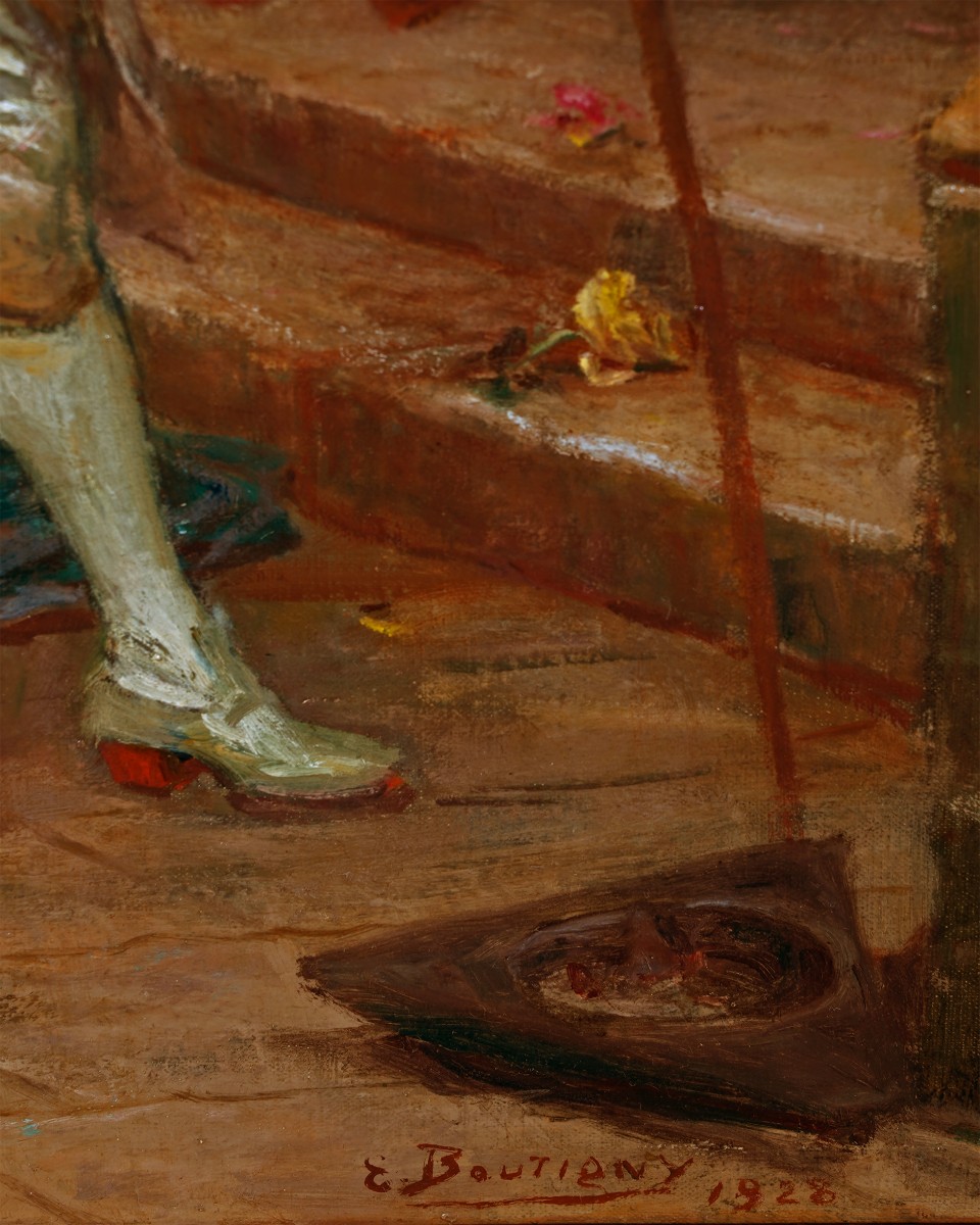 Paul?Émile?Boutigny (1853-1929) fait partie des peintres d’histoire et de genre mondain les plus appréciés de la Troisième?République. Élève d’Alexandre?Cabanel à l’École?des?Beaux?Arts de?Paris, il se spécialise très tôt dans les scènes de genre d’inspiration historique, principalement situées au XVIII? siècle. Il s’inscrit ainsi dans la tradition dite « néo-galante », héritière de Watteau, Fragonard ou Lancret, mais revisitée avec la sensibilité et la technique du XIX? siècle finissant. Il débute au?Salon des?Artistes?Français en?1881 et expose régulièrement au Salon où ses œuvres rencontrent un public favorable. Son succès repose sur une peinture séduisante, narrative et décorative, parfaitement adaptée aux intérieurs bourgeois et aristocratiques. À une époque marquée par l’essor de l’impressionnisme puis des avant-gardes, il choisit délibérément de rester fidèle à une esthétique classique, assumant un certain conservatisme stylistique. Au tournant du XX? siècle et jusqu’à la fin de sa vie, Boutigny poursuit cette voie avec constance. Ses œuvres tardives, notamment celles des années 1910–1920, témoignent d’une grande liberté de touche, tout en conservant la clarté du récit et l’élégance de la mise en scène. La matière picturale y devient parfois plus vibrante, traduisant une sensibilité accrue à la lumière et au mouvement.