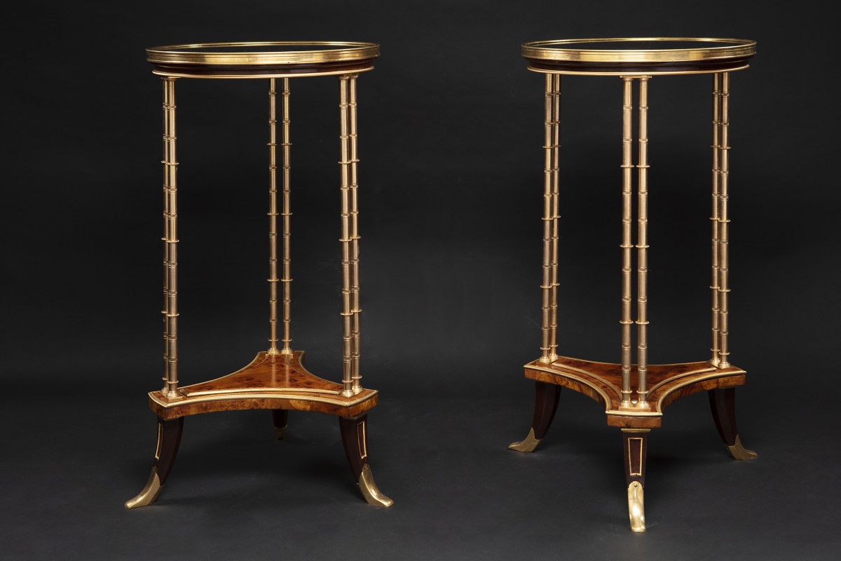 Paire de guéridons attribuée à Adam WEISWEILER en bronze finement ciselé et doré au mercure et bruyère de thuya. Dessus de marbre noir. France. Début du 19e siècle HxP 74x37 cm.