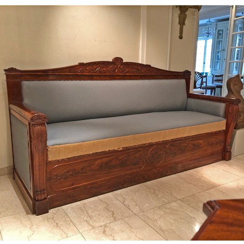 Paire de bancs Biedermeier aux sculptures complexes, aux accoudoirs demi-ronds et aux piliers latéraux ornés de feuilles d'acanthe. Au milieu des dossiers se trouvent deux motifs de fleurs stylisées avec un décor de volutes. Provenance : Rennbahn à Baden-Baden, Allemagne. Acajou, plaqué et massif.