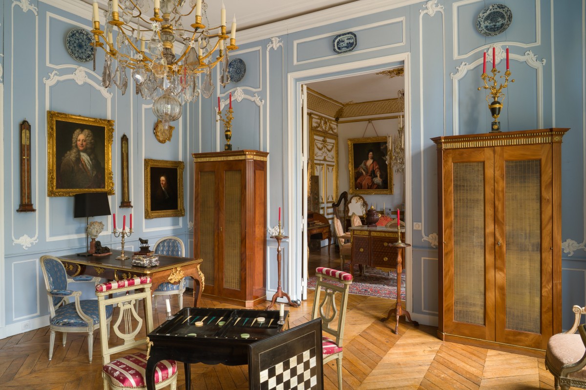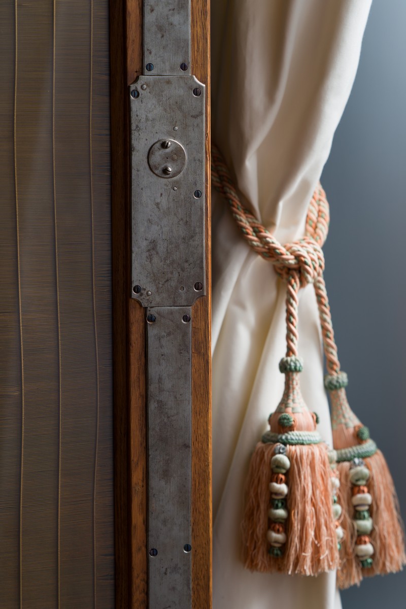 La façade ouvre à deux vantaux en partie vitrés et garnis d’un tissage de cuivre doré.