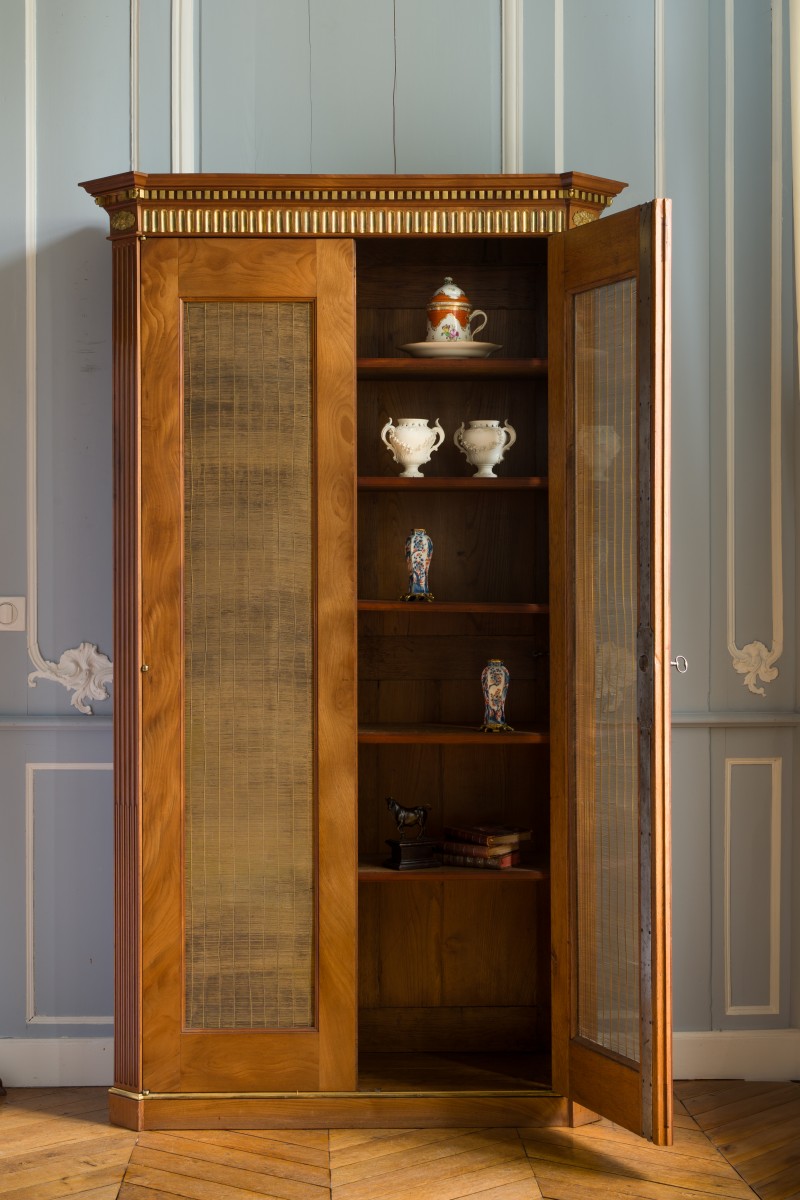 L’acajou habille surtout des meubles Louis XVI comme notre paire de bibliothèques ici présentée, aux lignes très rigoureuses mais sans sécheresse. Quant aux bronzes, assez réduits dans l’ensemble, ils figurent principalement sous forme de frises et demeurent très finement ciselés. Le doreur Habert est cité comme collaborateur.