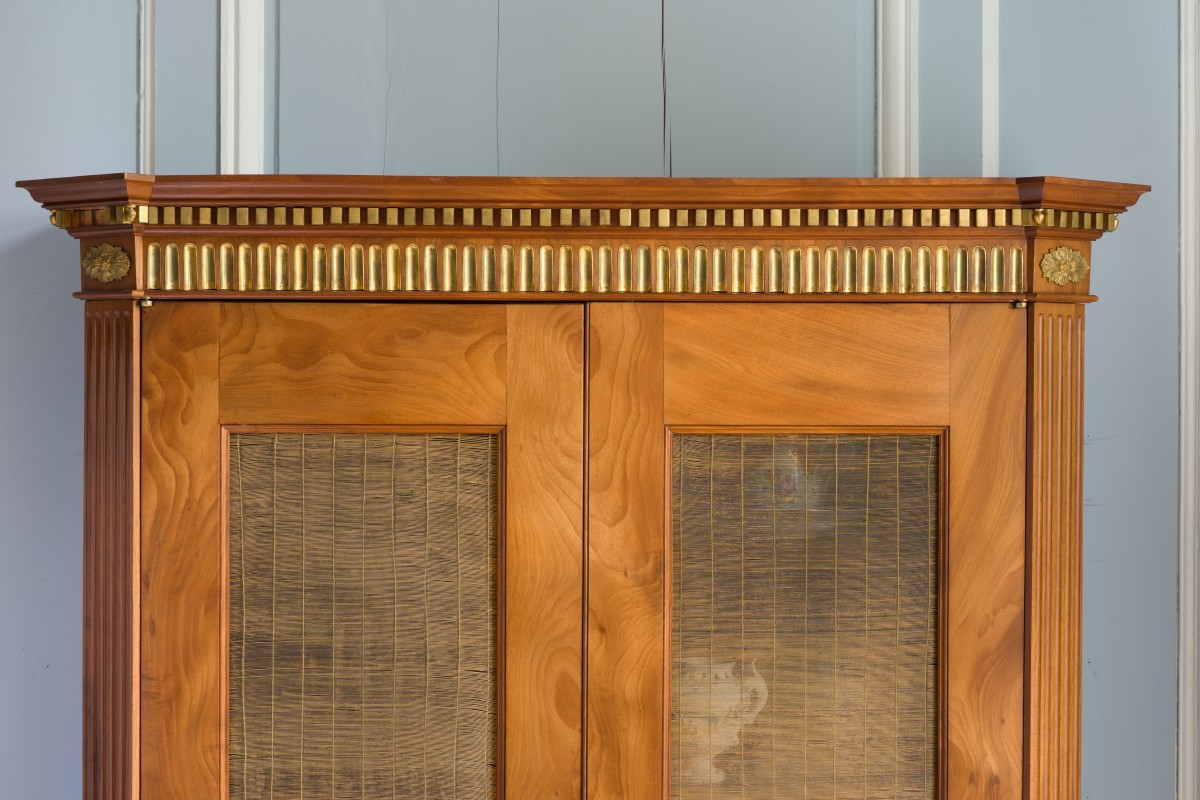 Le fronton à décrochement est décoré de cannelures en bronze doré surmontées de denticules en bronze doré également.