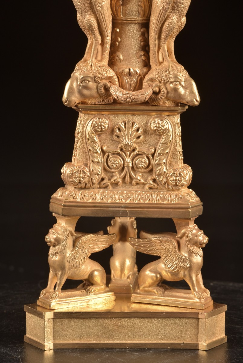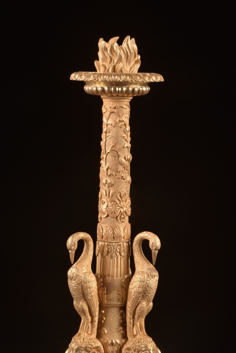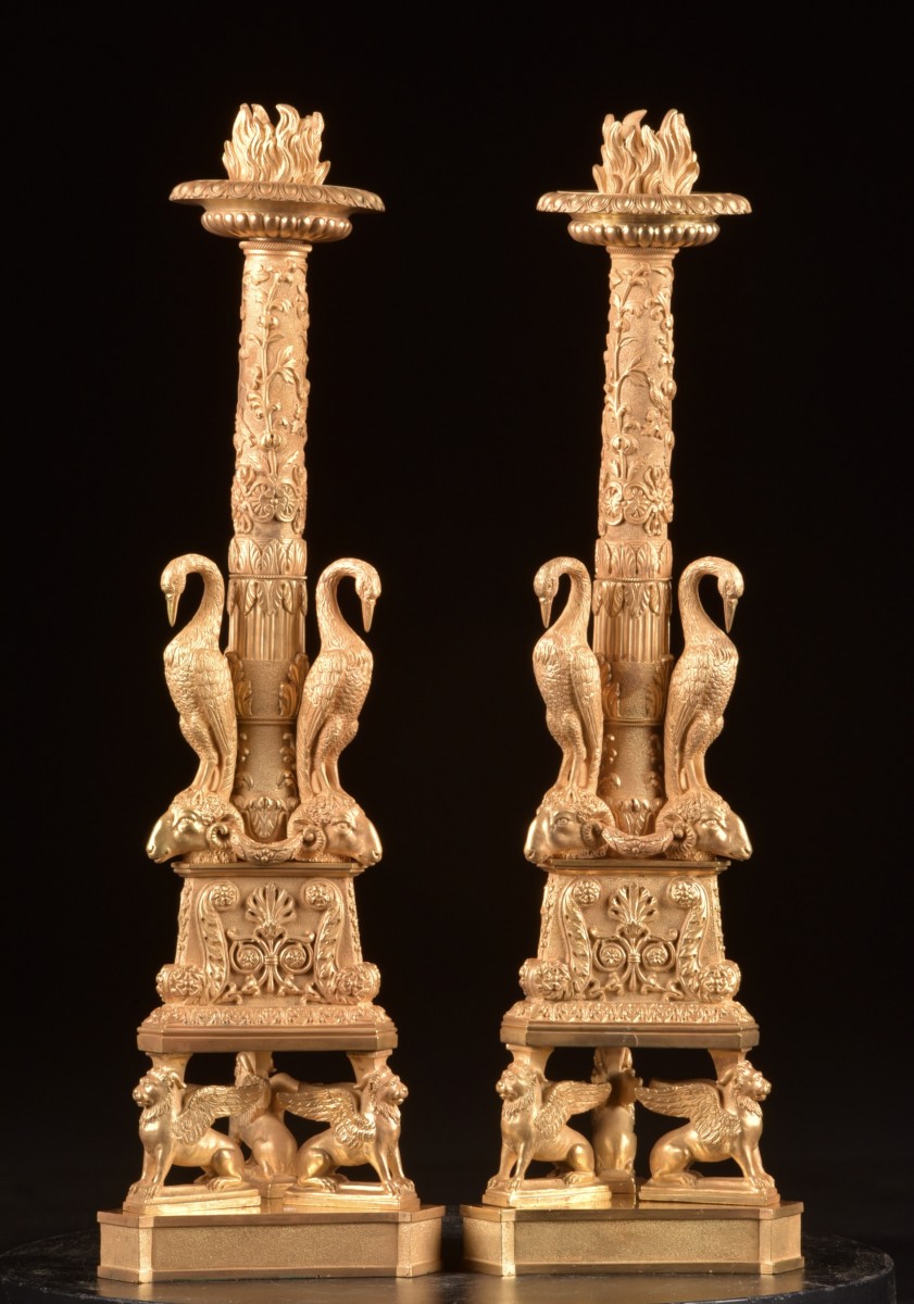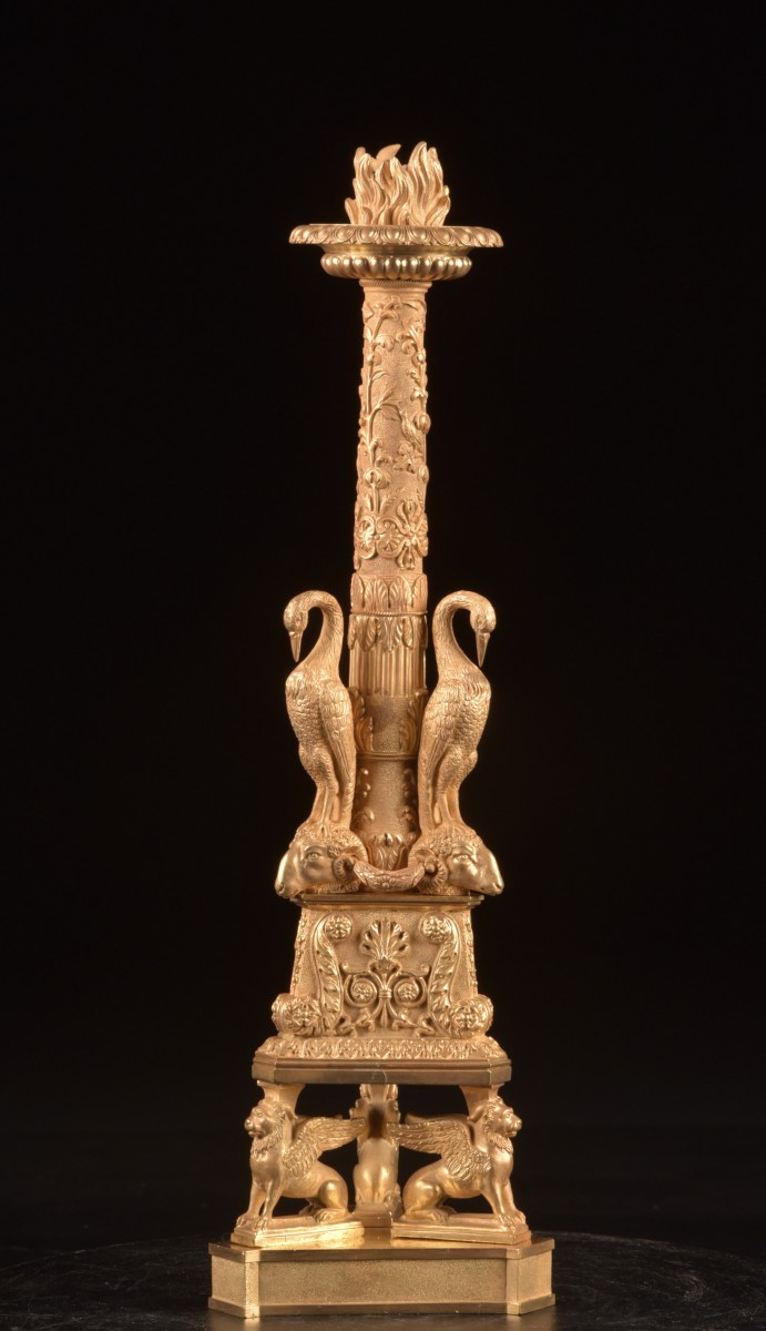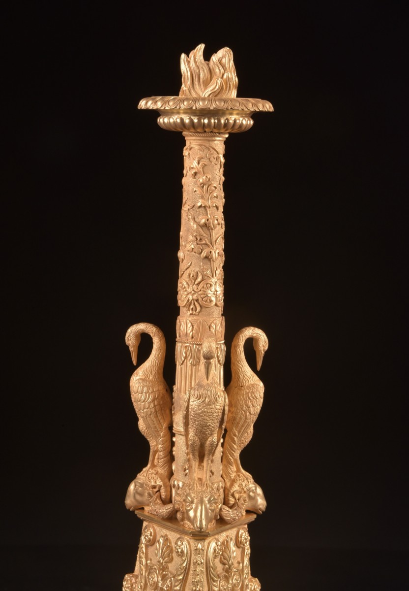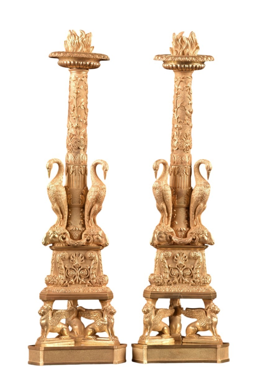 Ces candélabres reposent sur une base triangulaire soutenue par des sphinx, et présentent une tige en forme de colonne richement décorée.