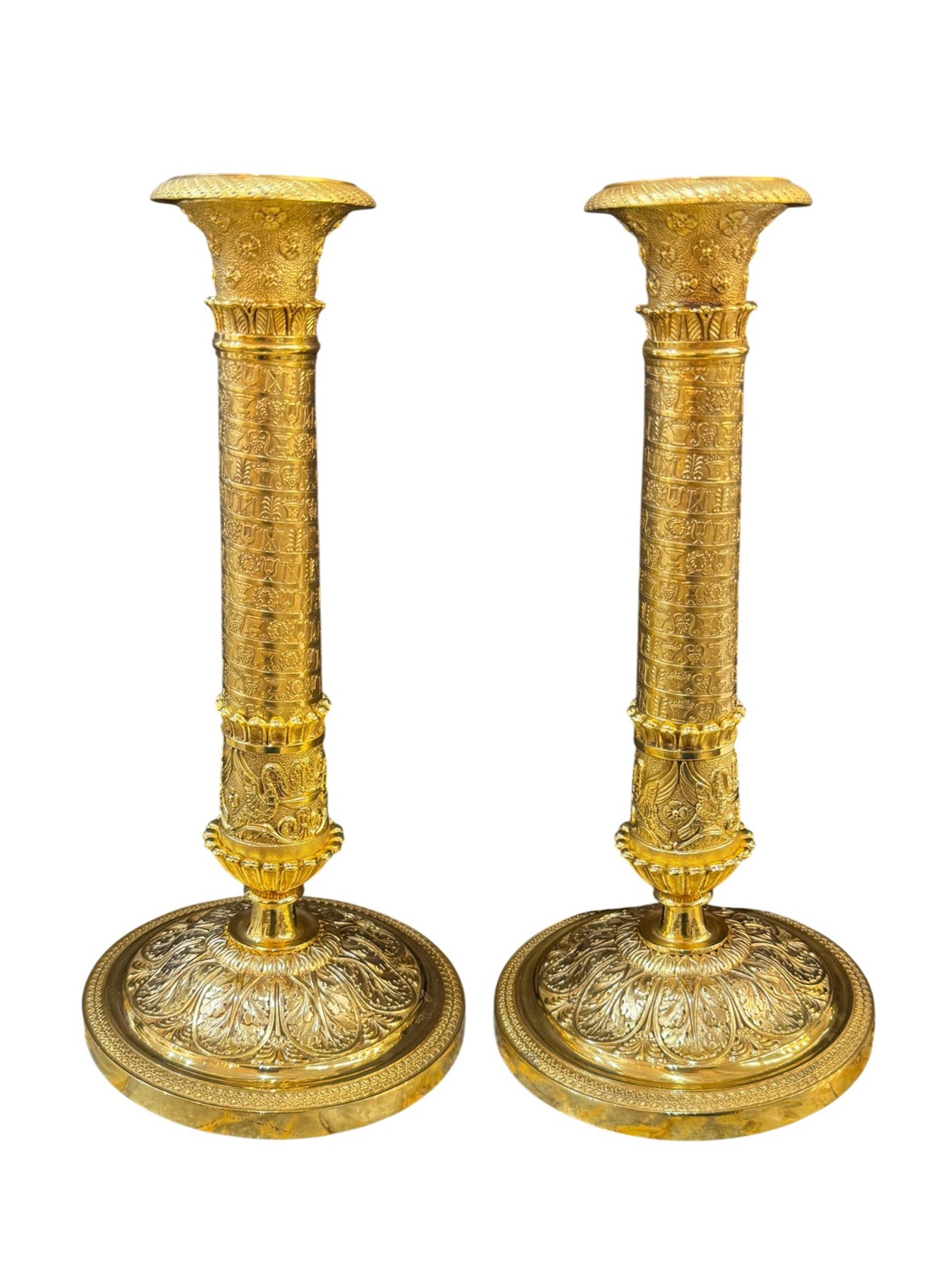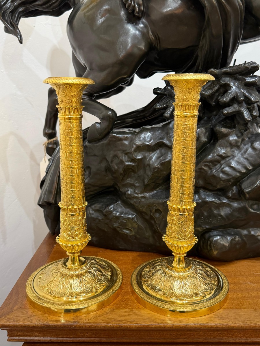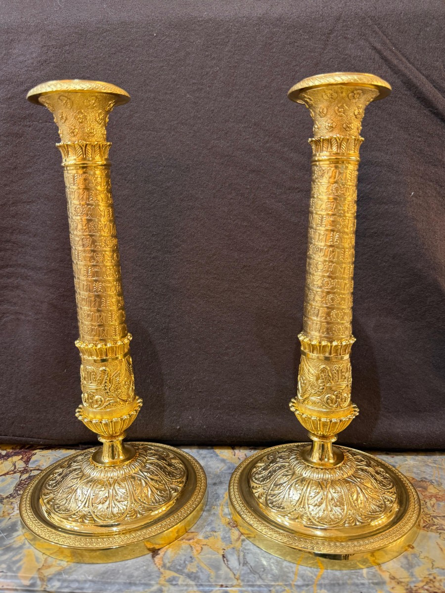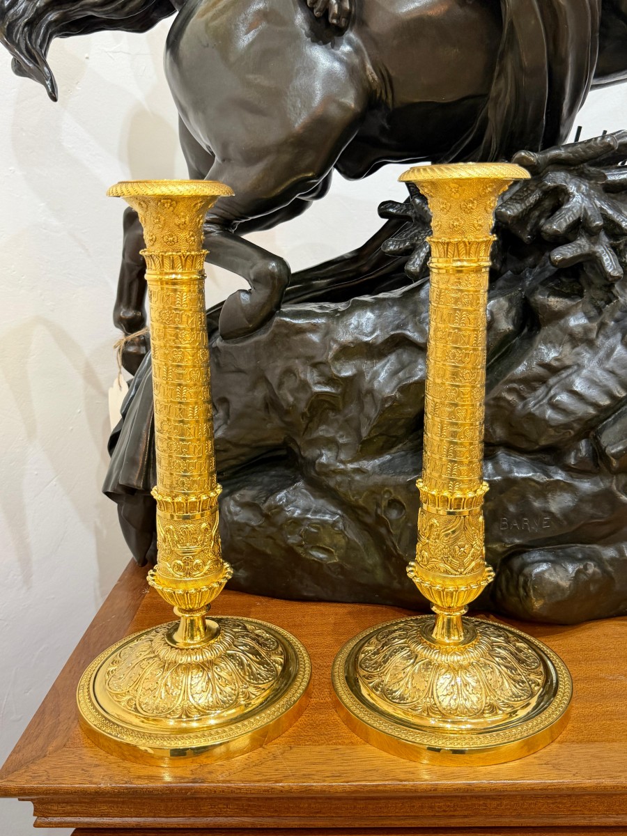 Exceptionnelle paire de grands bougeoirs en bronze, finement ciselée et dorée au mercure, de l’époque Restauration.