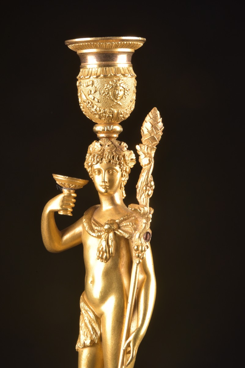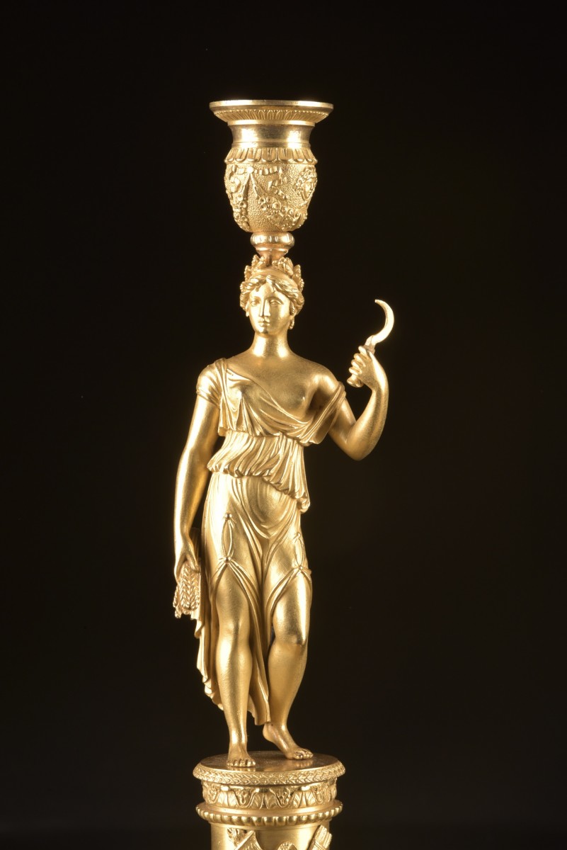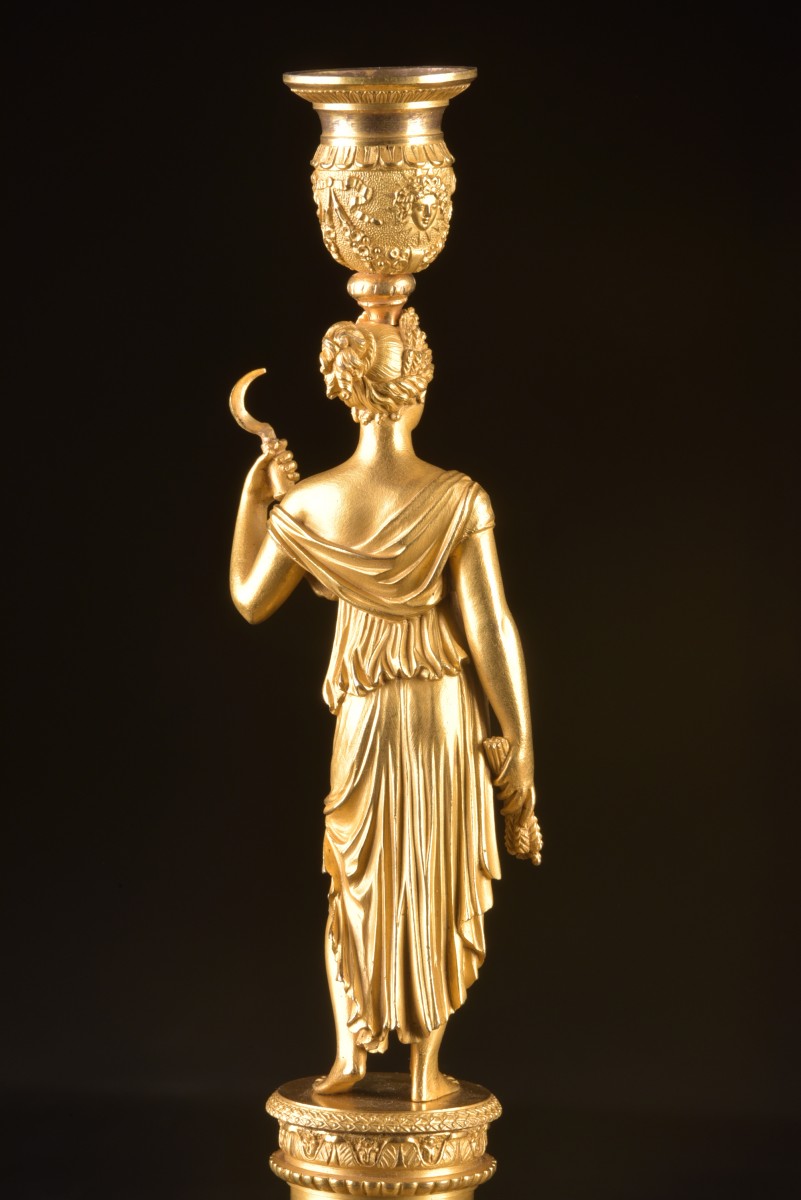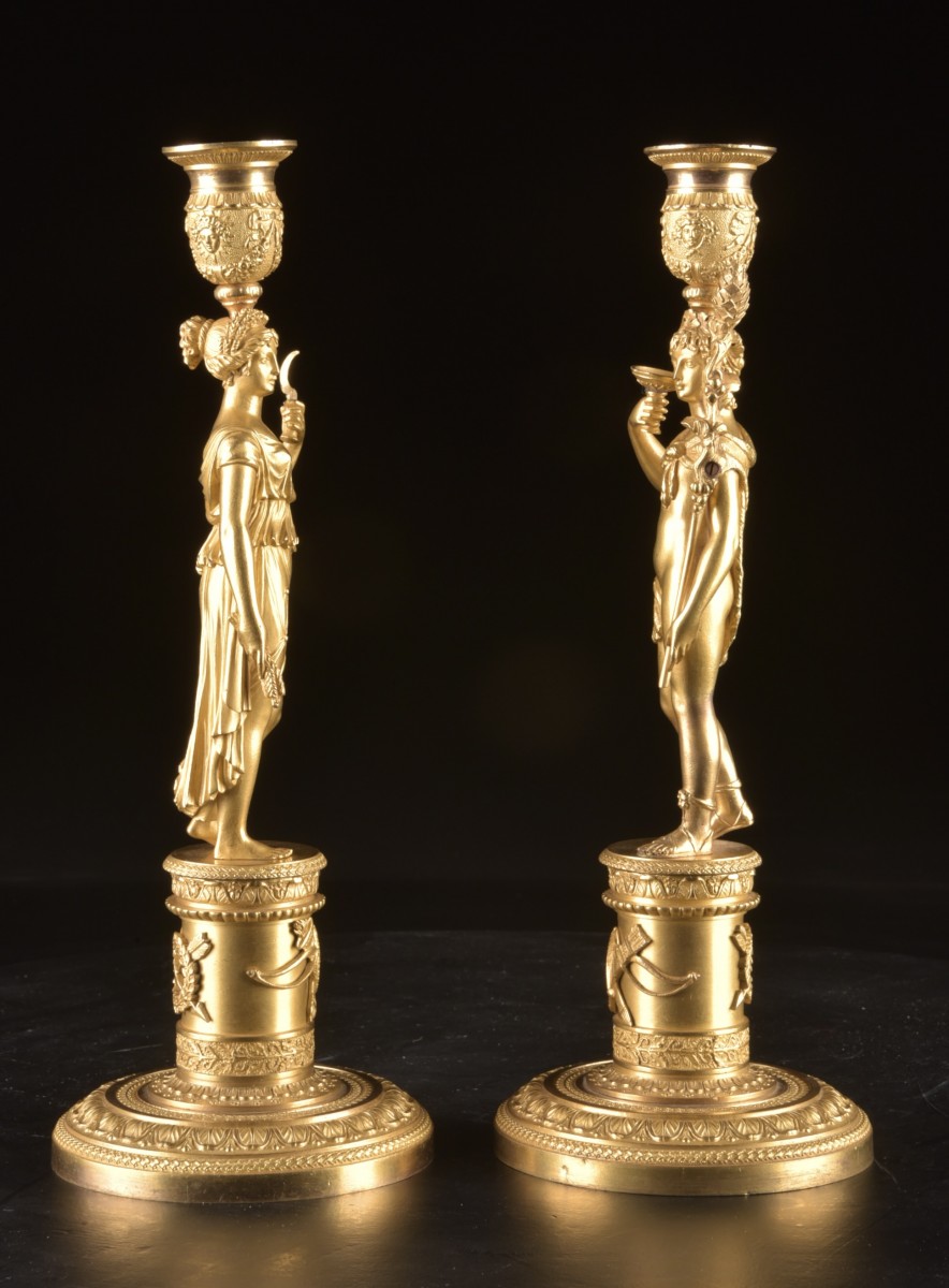 Exceptionnelle paire de bougeoirs d’époque Empire en bronze finement ciselé et entièrement doré, réalisée à Paris vers 1805–1810 et attribuée à Pierre-François Feuchère (1737–1823). Les fûts sont figurés sous forme allégorique des saisons. L’un représente l’Été sous les traits de Cérès, déesse de l’agriculture, figurée en jeune femme drapée tenant une gerbe de blé et une faucille. L’autre incarne l’Automne sous la forme du jeune Bacchus, reconnaissable à sa chevelure ornée de pampres, à la dépouille de léopard et à ses attributs, une coupe et un thyrse enlacé de vigne. Chaque figure supporte sur la tête un binet en forme de vase. Le décor intègre des références symboliques au cycle du jour et de la nuit, à travers un masque rayonnant d’Apollon et une tête de Méduse coiffée d’un croissant lunaire. Les bases cylindriques sont ornées de couronnes de laurier encadrant des flèches croisées, reposant sur un piédouche circulaire ...
