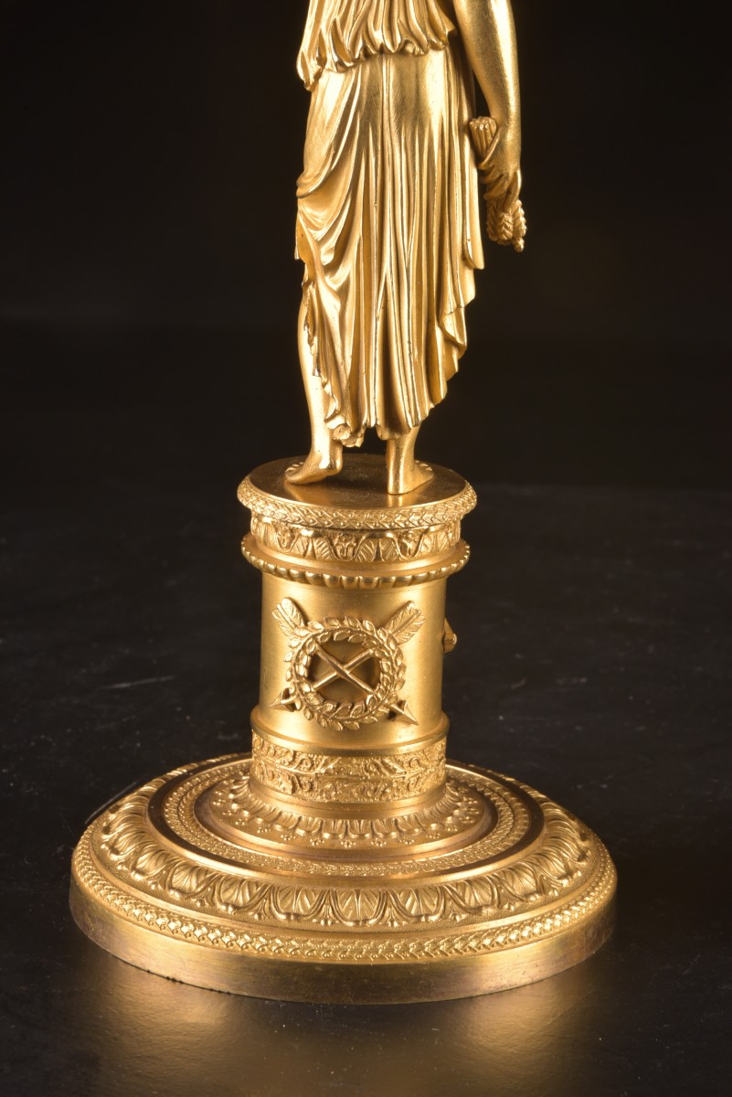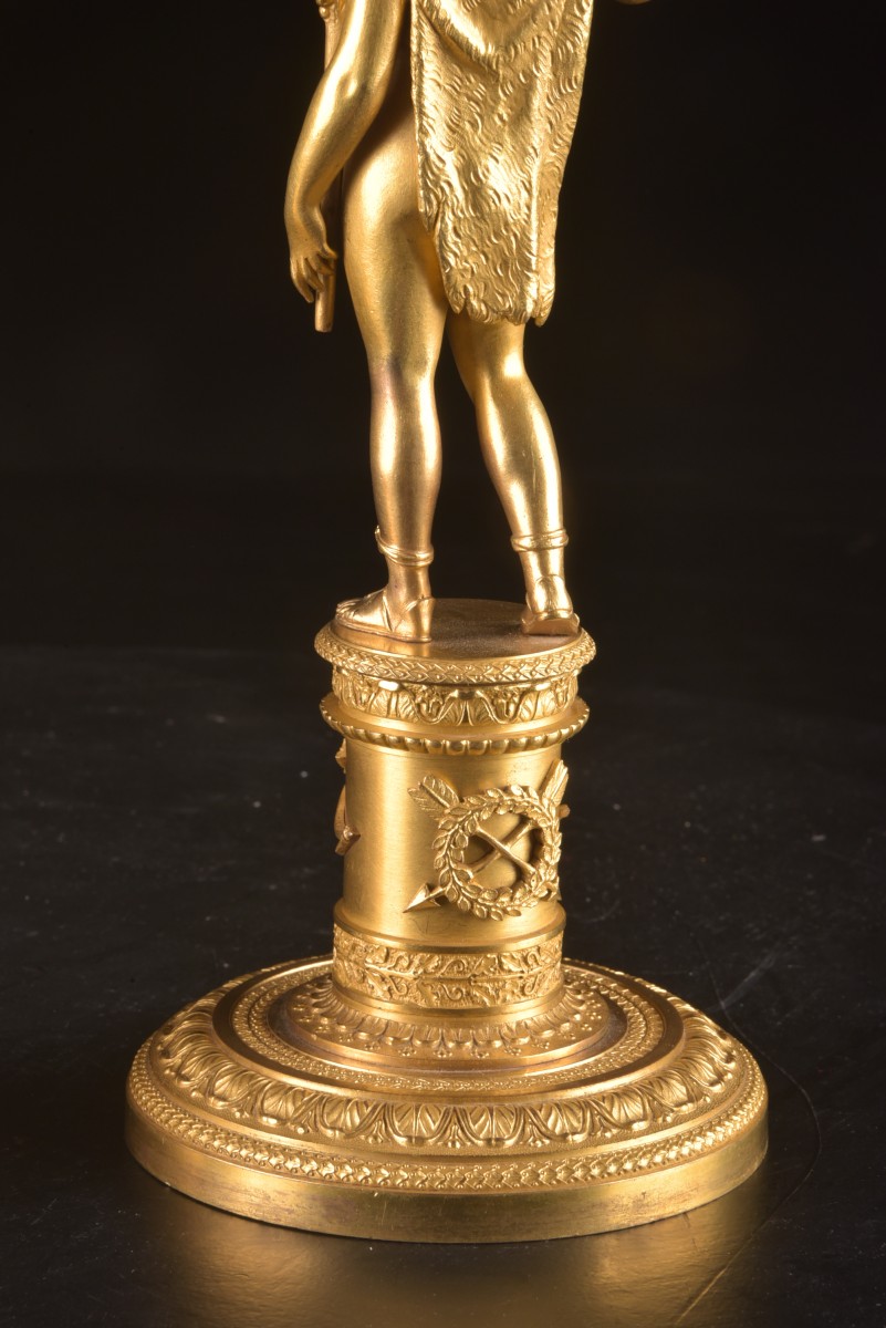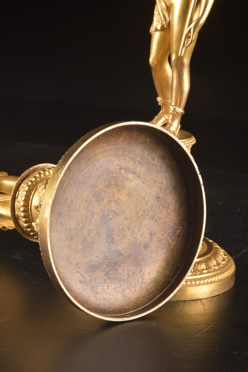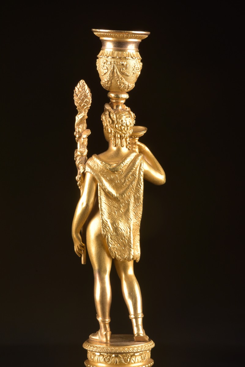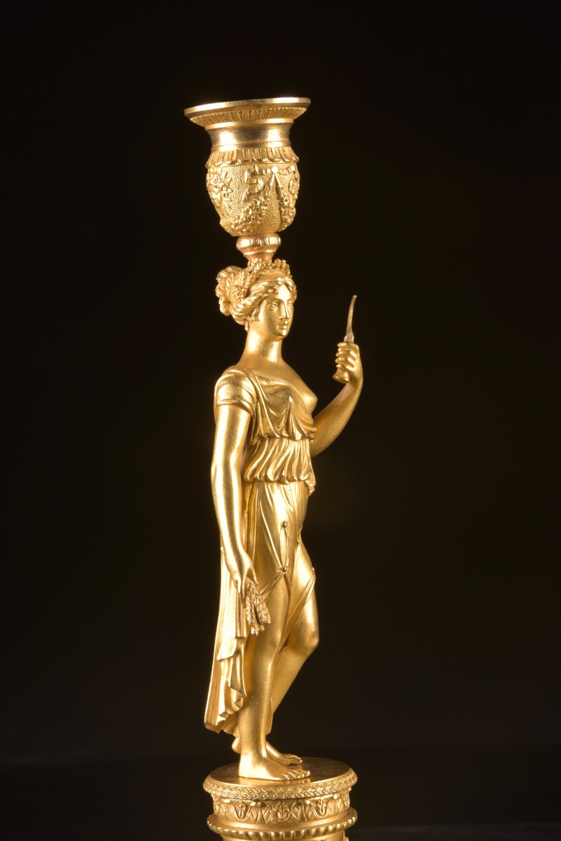 Exceptionnelle paire de bougeoirs d’époque Empire en bronze finement ciselé et entièrement doré, réalisée à Paris vers 1805–1810 et attribuée à Pierre-François Feuchère (1737–1823). Les fûts sont figurés sous forme allégorique des saisons. L’un représente l’Été sous les traits de Cérès, déesse de l’agriculture, figurée en jeune femme drapée tenant une gerbe de blé et une faucille. L’autre incarne l’Automne sous la forme du jeune Bacchus, reconnaissable à sa chevelure ornée de pampres, à la dépouille de léopard et à ses attributs, une coupe et un thyrse enlacé de vigne. Chaque figure supporte sur la tête un binet en forme de vase. Le décor intègre des références symboliques au cycle du jour et de la nuit, à travers un masque rayonnant d’Apollon et une tête de Méduse coiffée d’un croissant lunaire. Les bases cylindriques sont ornées de couronnes de laurier encadrant des flèches croisées, reposant sur un piédouche circulaire ...