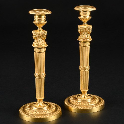 Superbe paire de bougeoirs Empire en bronze doré à bustes féminins attribués au bronzier parisien Claude Galle (1759-1815). Les portes-bougies, conçus en forme de vase, reposent sur trois bustes féminins classiques, appelés Merveilleuses. Chaque buste est orné d’une coiffure traditionnelle, complétée par un bandeau floral et un collier de perles autour du cou. Les fûts cannelés, agrémentés de plusieurs bandes annulaires ornées, se terminent par trois paires de petits pieds, tous soutenus par des bases circulaires présentant des frises de fleurs sur fond guilloché, bordées d’une frise d’étoiles et de godrons. L’ensemble est exécuté en bronze doré au mercure, présentant un beau contraste entre la dorure mate et la dorure brillante.