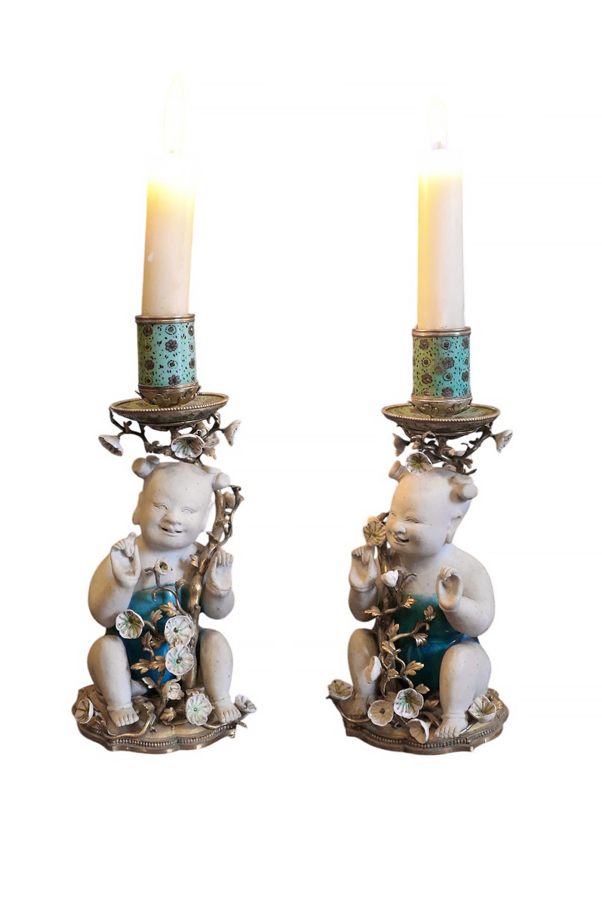 Paire de bougeoirs en porcelaine et biscuit de Chine d'époque Kangxi (1662-1722), émail bleu et monture de bronze doré d'époque Régence, vers 1720, ornés d'un magot et de fleurs, le binet et la bobèche en émail bleu à semi de fleurs.