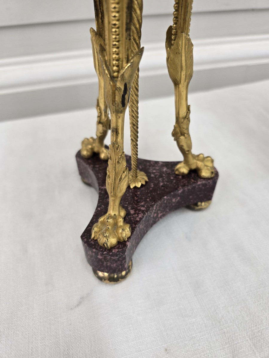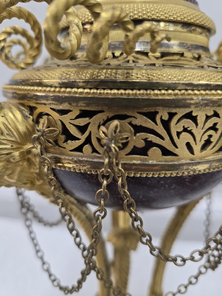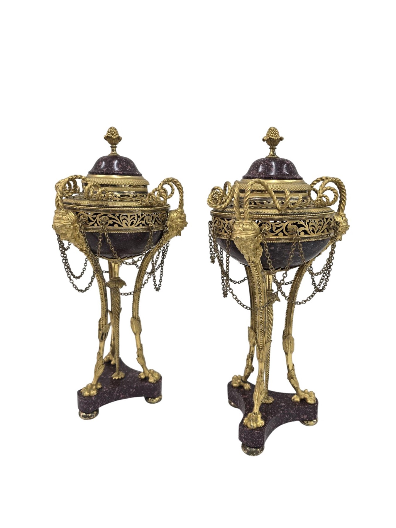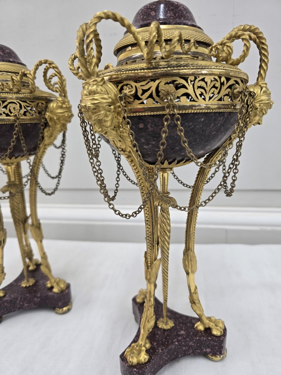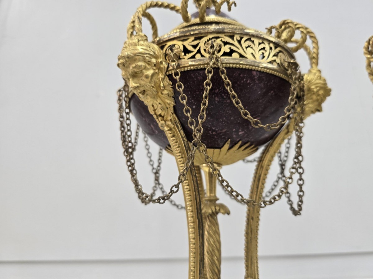 Exceptionnelle paire de brûle-parfum en bronze doré et porphyre à tête de faune et pieds griffés, et par une tige torsadée,sont surmontées d'une frise ajourée en cuivre doré à décor de feuilles d'ornement. Leurs couvercles en porphyre et surmontés d'une graine. Attribuée à Pierre Gouthière 1732-1813