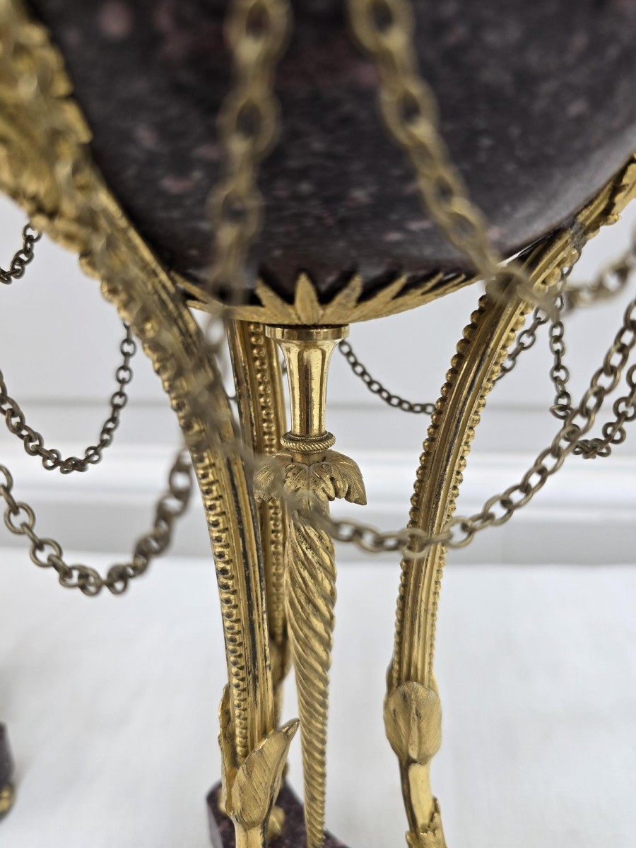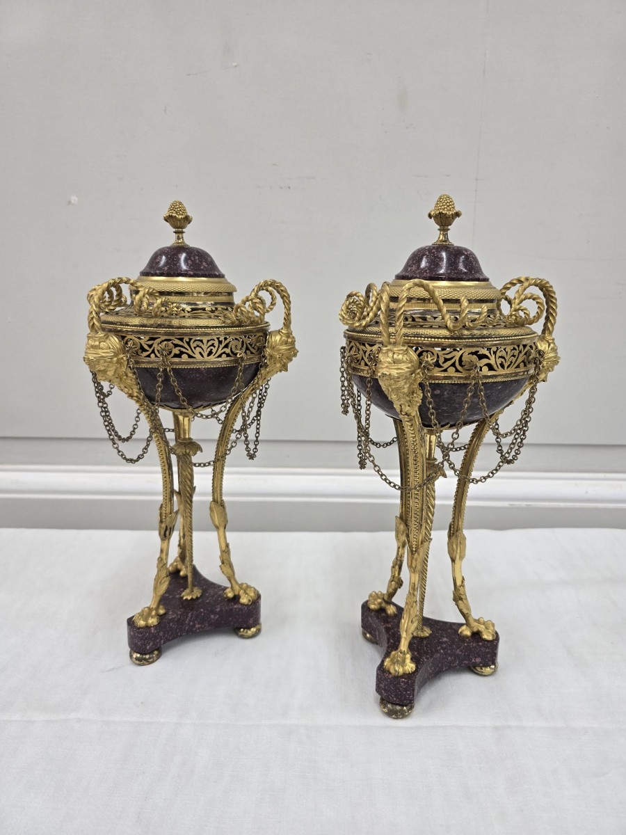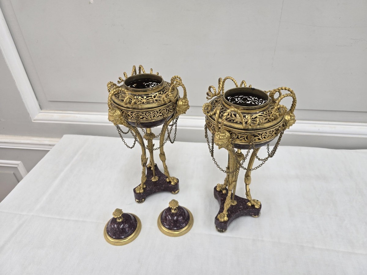 Retrouver le mobilier ou les objets d''art similaires à « Paire de brûle-parfum Louis XVI » présenté par La Jurande, antiquaire à Barlieu dans la catégorie Cassolettes, coupe et vase Louis XVI, Objet de décoration.