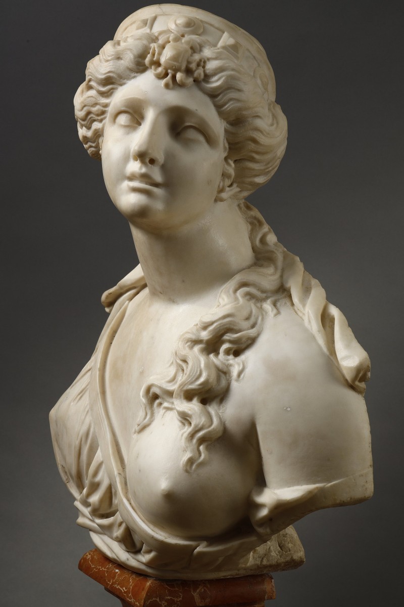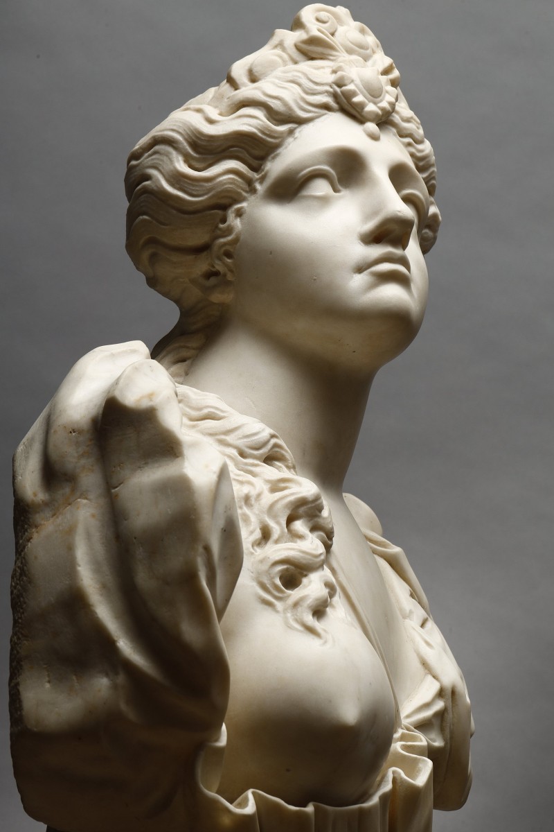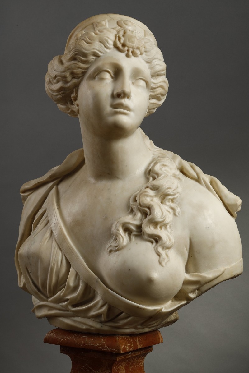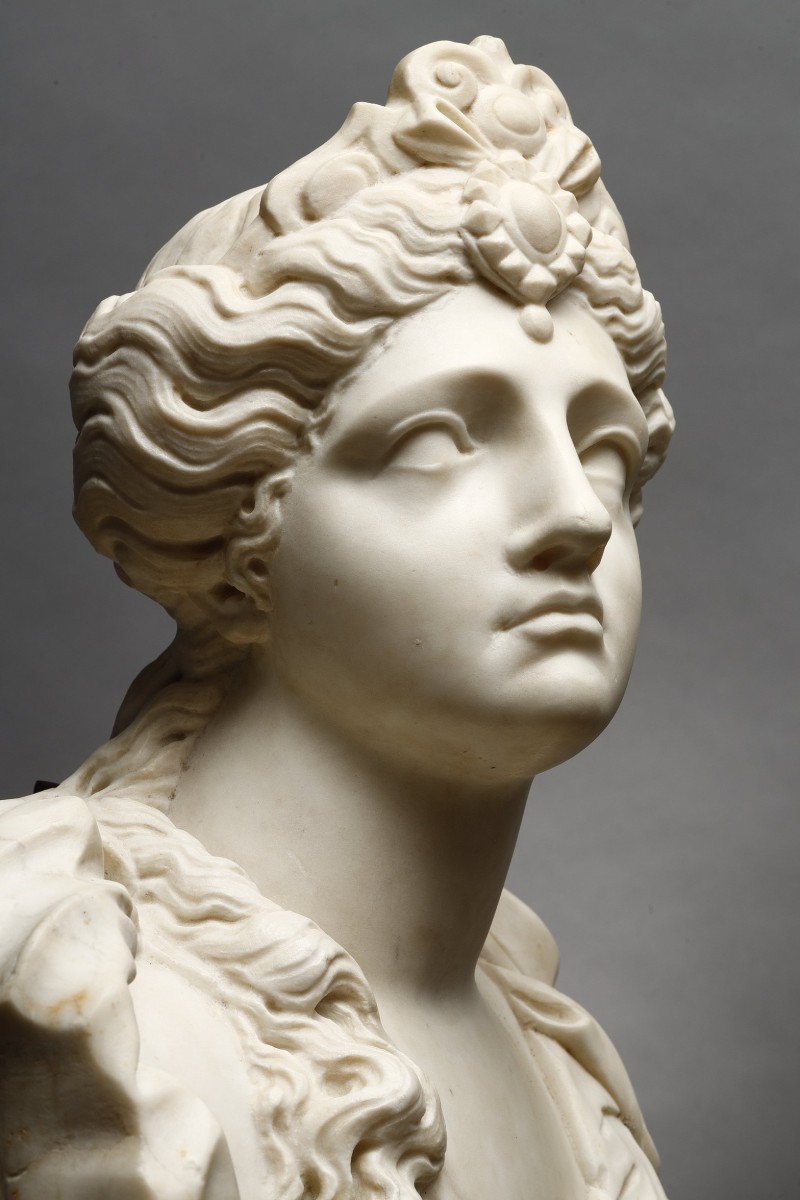 Le traitement des chairs, d’une douceur exquise, contrastant avec ce drapé vigoureusement plissé qui révèle un sein, symbole de féminité et de beauté, souligne ainsi le grand savoir faire du sculpteur.