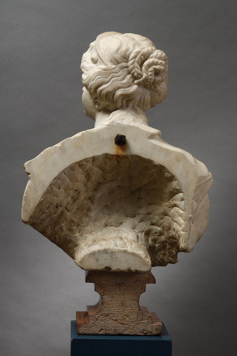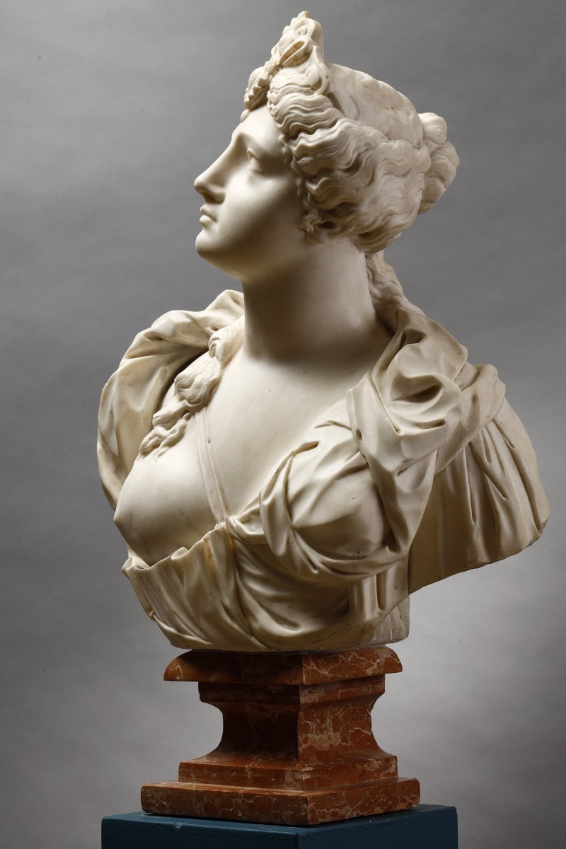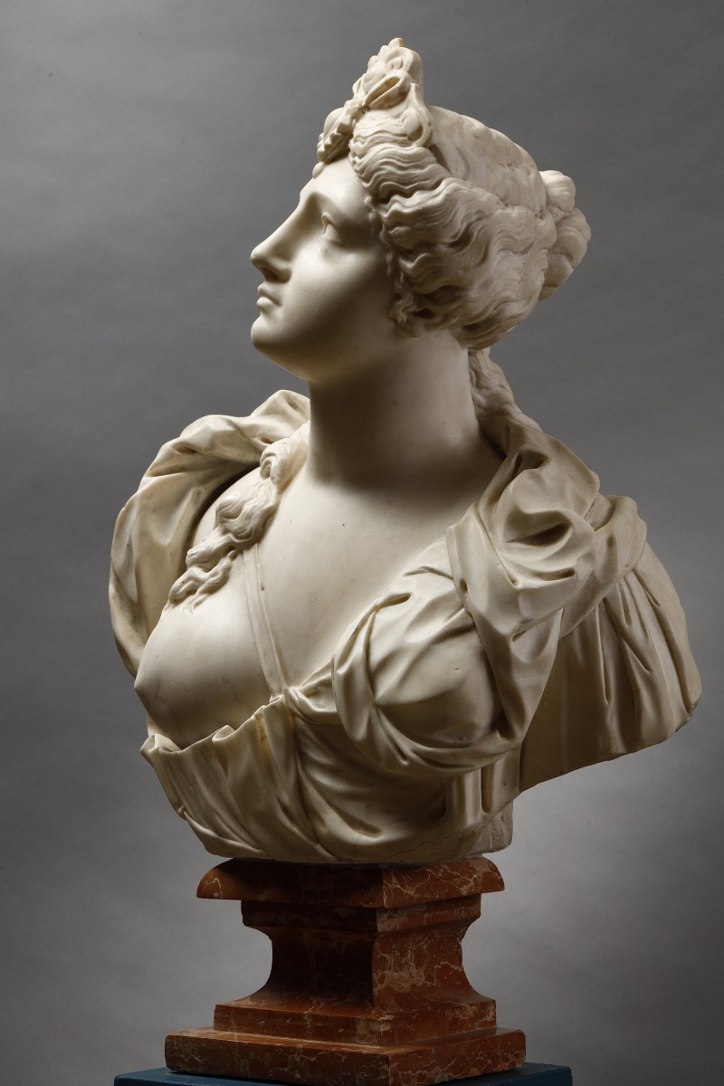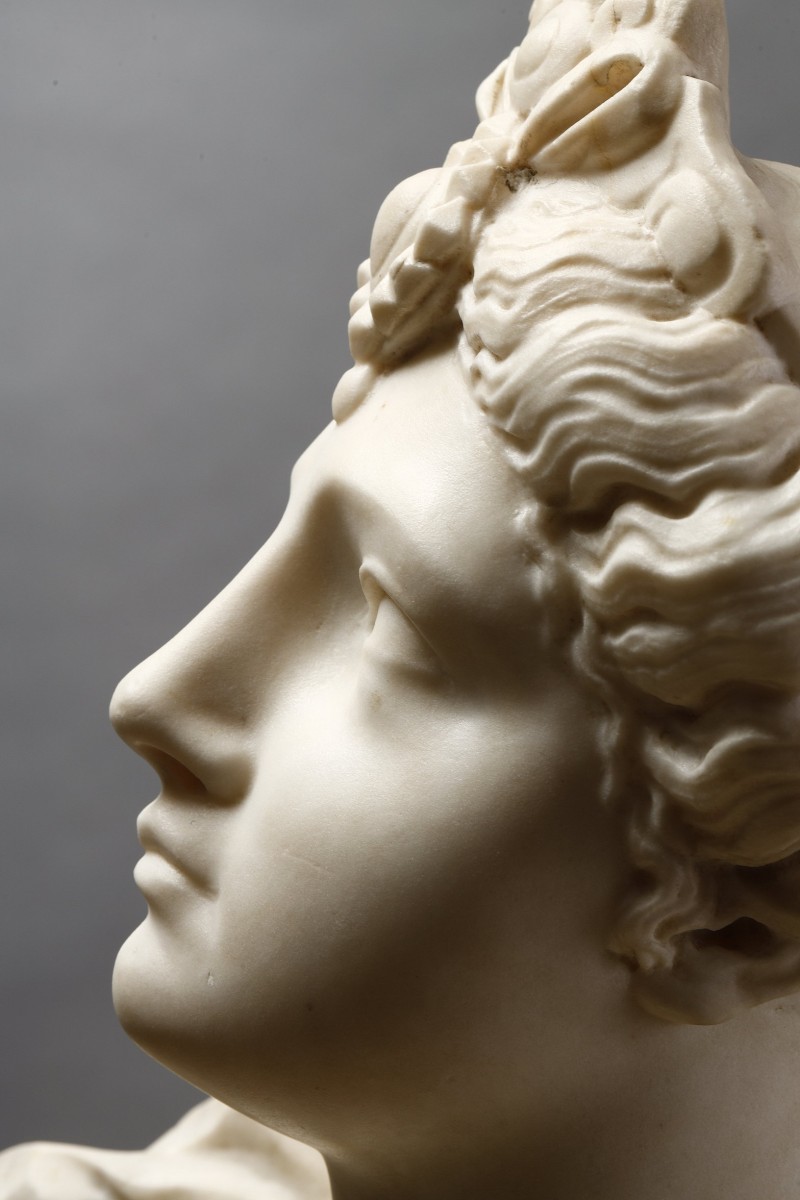 Le traitement des chairs, d’une douceur exquise, contrastant avec ce drapé vigoureusement plissé qui révèle un sein, symbole de féminité et de beauté, souligne ainsi le grand savoir faire du sculpteur.
