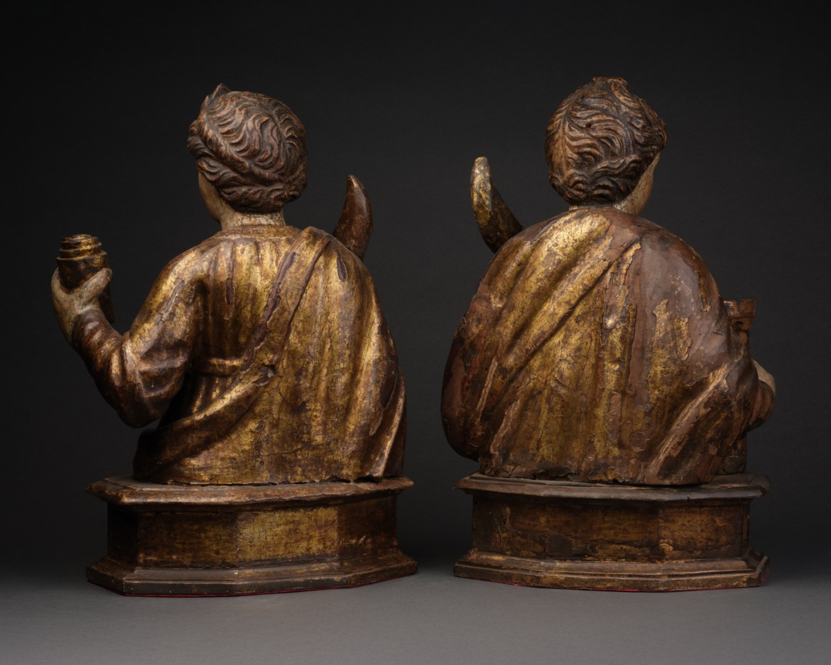 Ces deux bustes en bois doré sont typiques de la production d’Italie centrale de la Renaissance tardive, ils représentent deux saintes montées en reliquaire. À gauche, une sainte tient un parchemin, une palme et un livre, peut-être sainte Catherine de Sienne. À droite, une autre présente également une palme et une maquette de tour, évoquant sainte Barbe. Les visages, aux traits délicats, sont rehaussés de polychromie tandis que les vêtements et attributs sont couverts feuilles d’or, soulignant le raffinement technique de l’époque. Les bustes, conçus pour abriter des reliques, sont encadrés d’un médaillon doré, rappelant leur fonction dévotionnelle. Les socles, également dorés, renforcent leur caractère sacré.