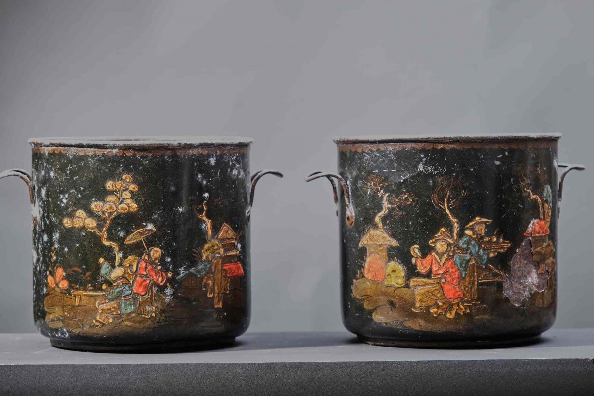 Des scènes figuratives chinoises sont représentées dans des paysages fantastiques caractéristiques. La peinture est adaptée à la substance pâteuse de la laque. Paire de cache-pots français très précoce et peinte de manière plastique. Milieu du 18e siècle