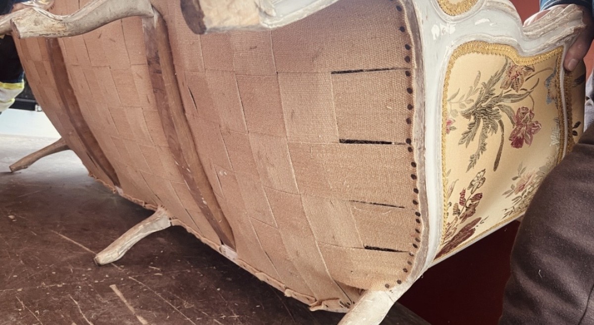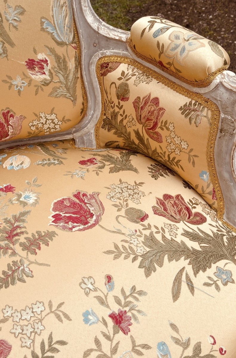 Ils sont recouvert d'un tissu damas de soie brodé de fleurs rouges, jaunes et bleues.