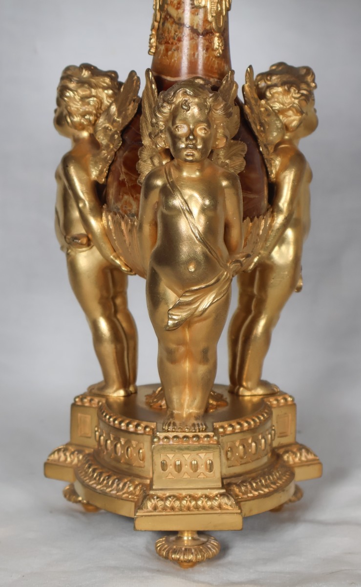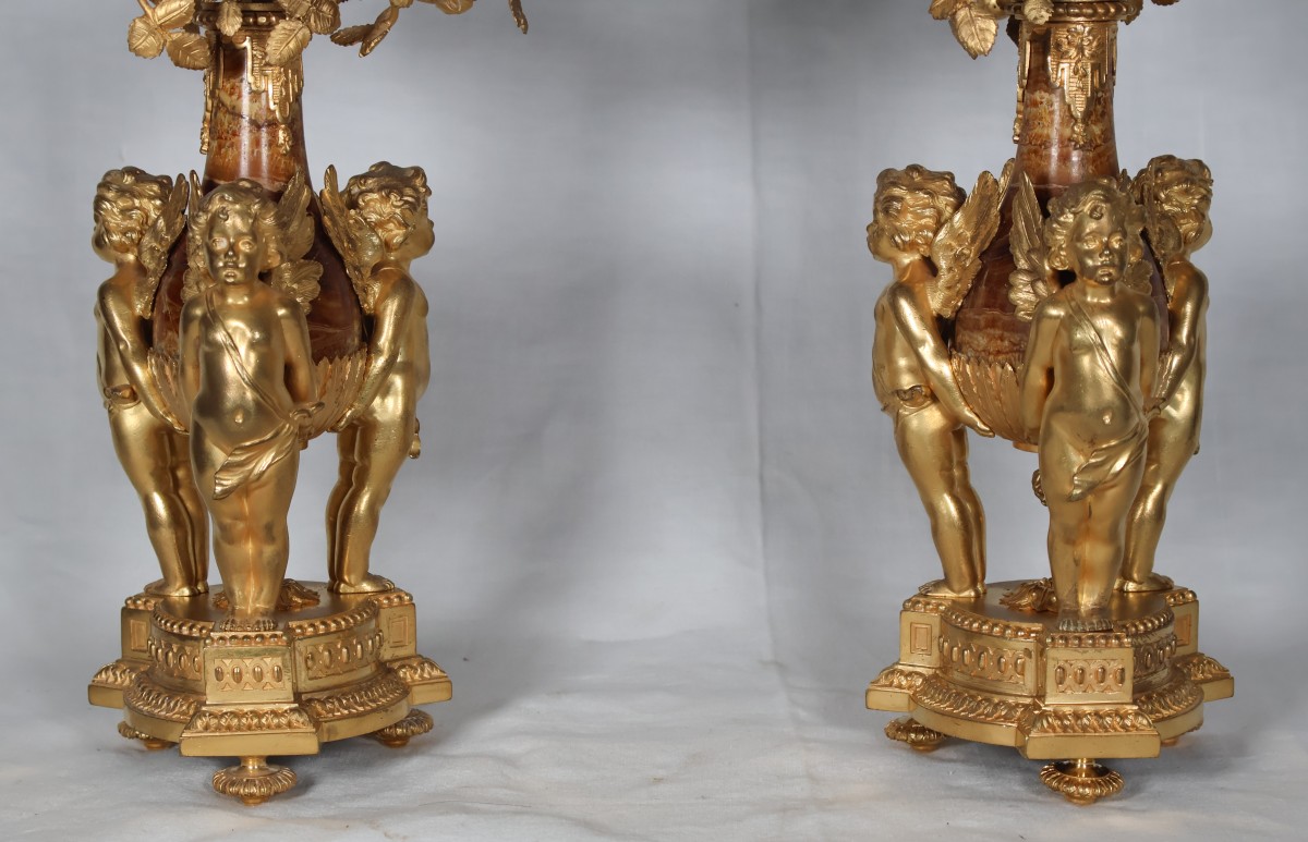 Chaque pièce présente trois putti ailés soutenant un vase en marbre brèche violette surmonté d’un bouquet de roses formant trois bras de lumière.