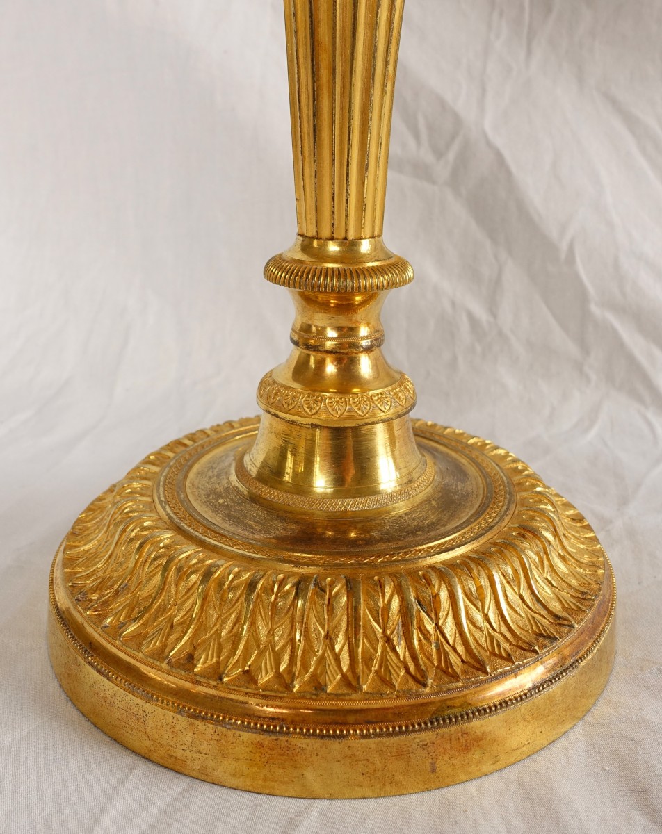 Beau modèle à cannelures, rangs de perles, sur une base de flambeaux vient s'emboiter 3 bras de lumière à motif torsadé, le binet central garni d'une flamme amovible formant un 4e bras de lumière. Ils sont composés de plus de 25 pièces indépendantes, ce qui est un signe de grande qualité. Très belle et fine ciselure et dorure au mercure en mat et brillant.