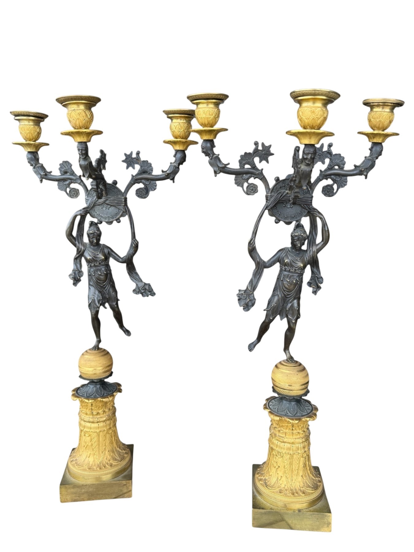Chaque candélabre repose sur une base carrée à décor de palmettes et feuillages stylisés, surmontée d’un piédouche cylindrique orné de frises délicatement gravées. Une sphère dorée finement guillochée supporte une figure féminine drapée à l’antique, traitée en bronze patiné, représentée en léger mouvement, tenant au-dessus de sa tête un médaillon central noué de rubans.