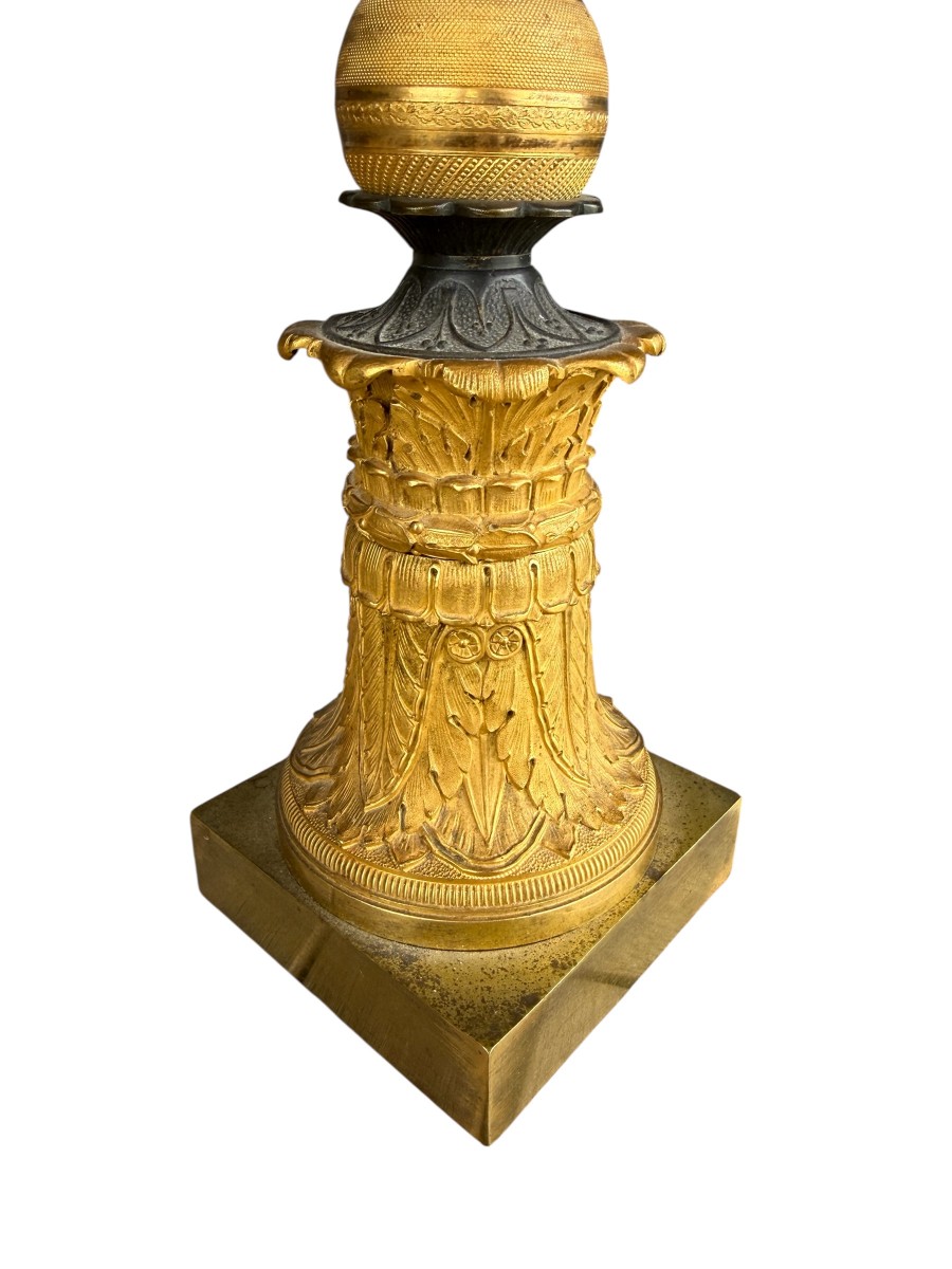 Retrouver le mobilier ou les objets d''art similaires à « Paire de candélabres en bronze doré - Époque empire » présenté par Bergmans Scott Fine Arts, antiquaire à Lommel dans la catégorie Bougeoirs et Chandeliers Empire, Luminaires.