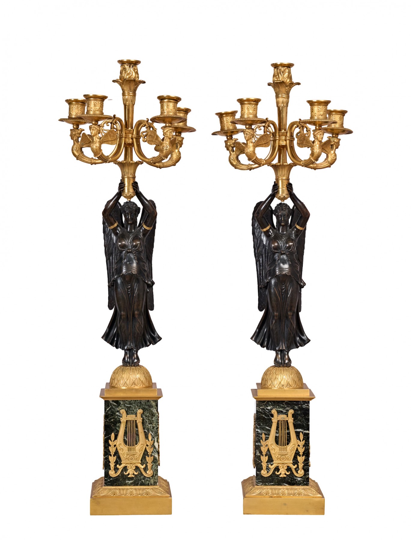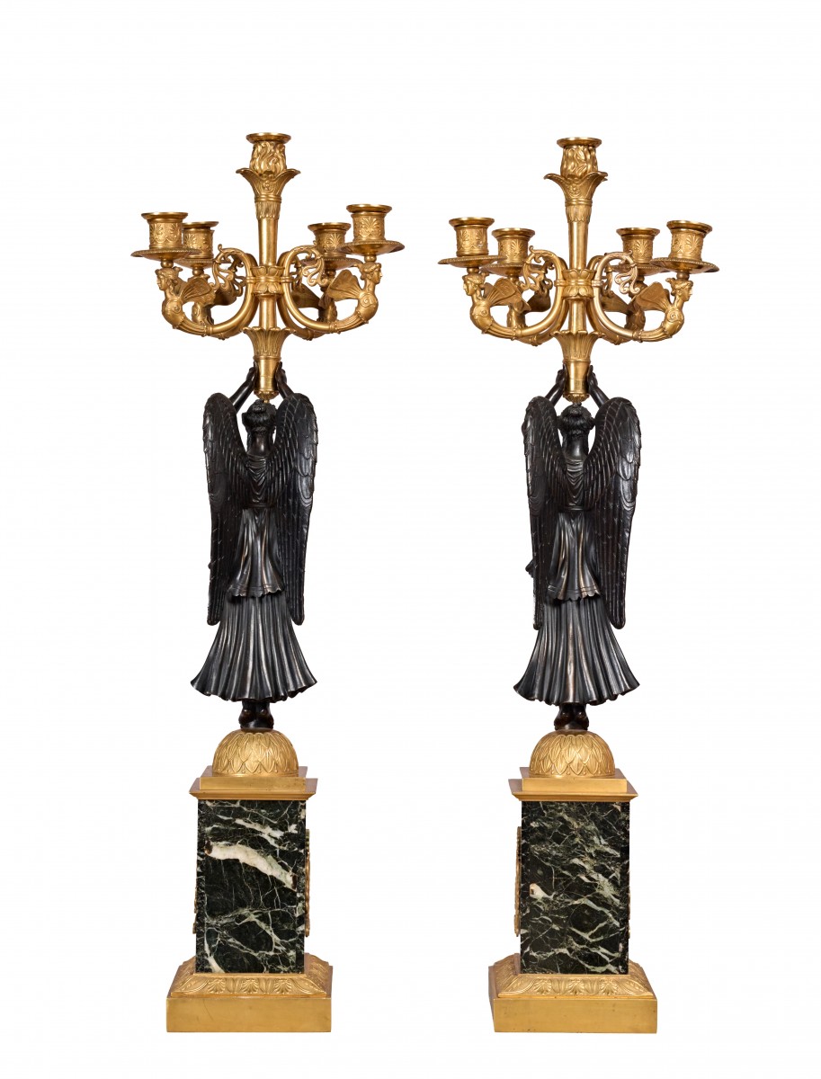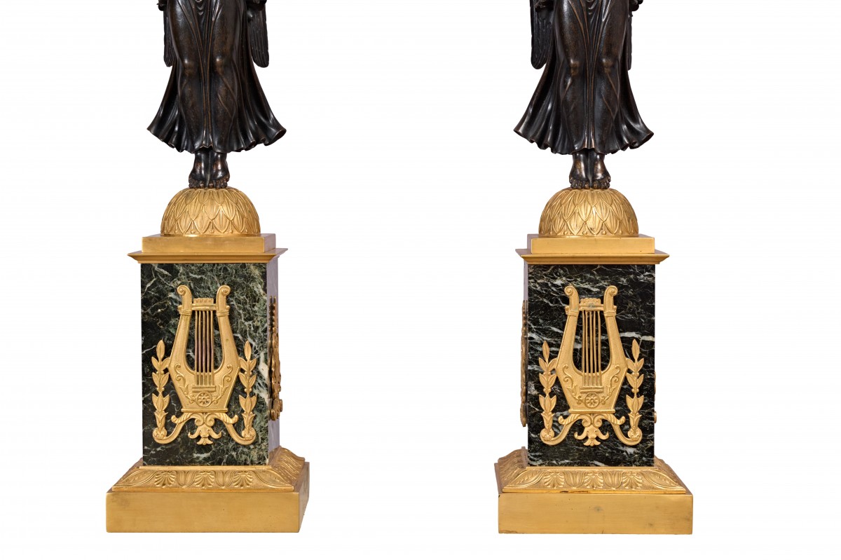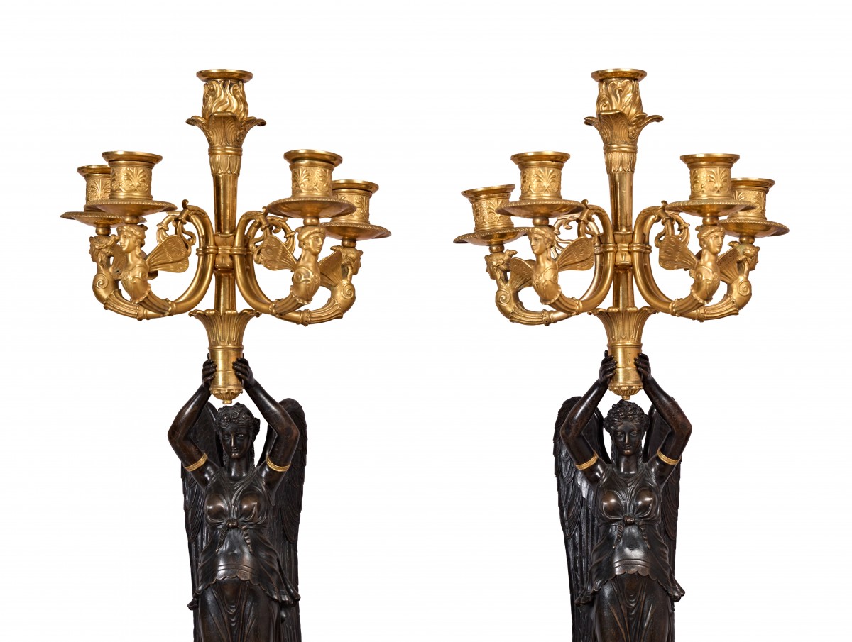 Retrouver le mobilier ou les objets d''art similaires à « Paire de candélabres Empire aux cariatides » présenté par Costermans Antiquités, antiquaire à Bruxelles dans la catégorie Bougeoirs et Chandeliers Empire, Luminaires.