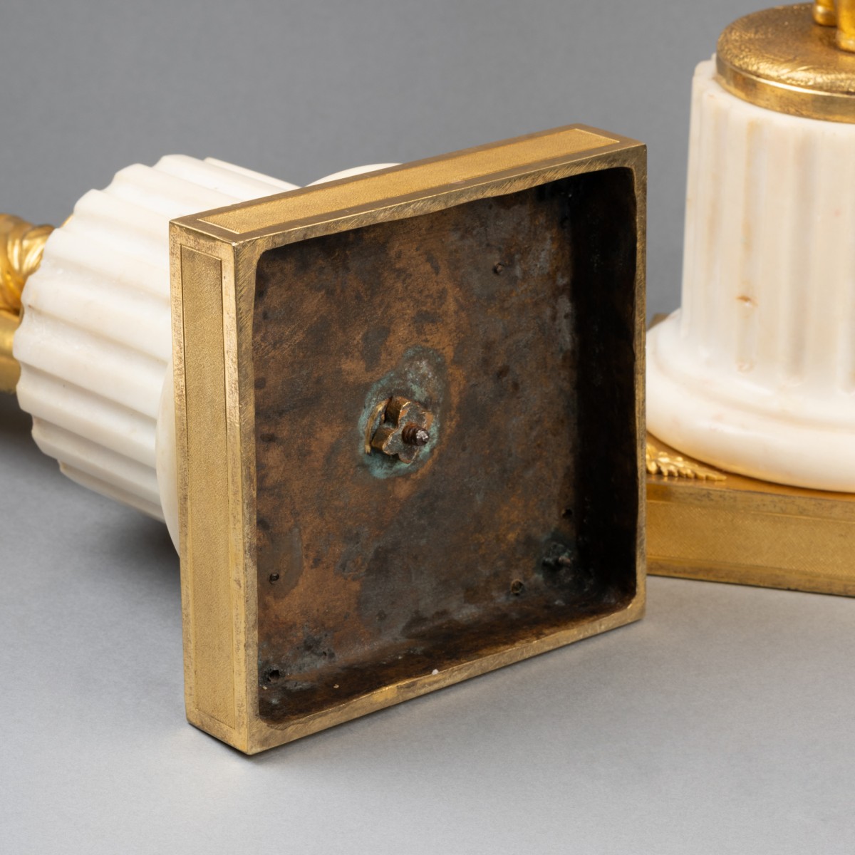 Il s'agit de deux sujets dits "enfants jardiniers" en bronze ciselé et doré tenant à bout de bras des bouquets de tulipes formant luminaires ; ils reposent sur deux socles en colonne tronquée cannelée de marbre blanc, elle-même soutenue par une base quadrangulaire de bronze doré.