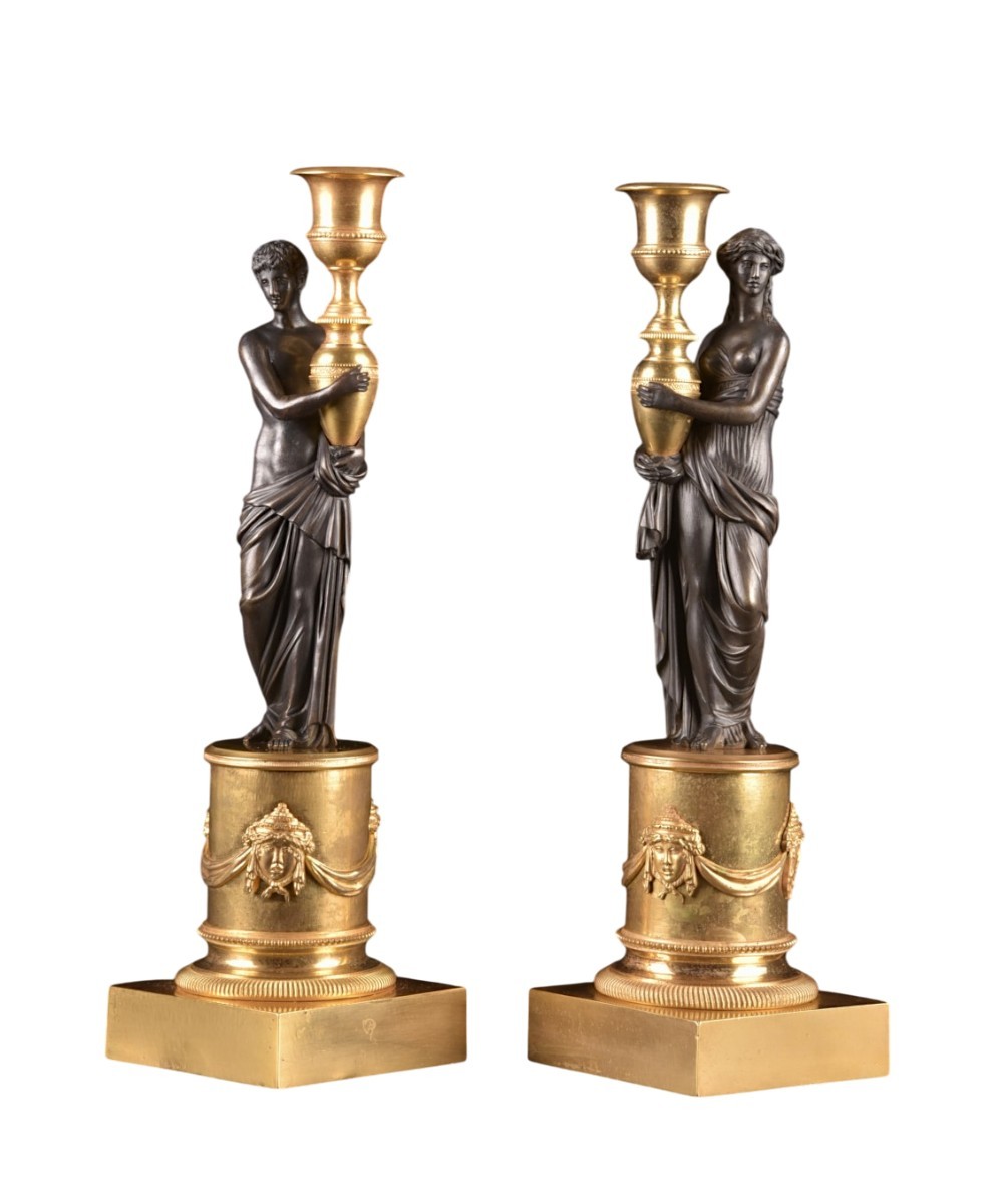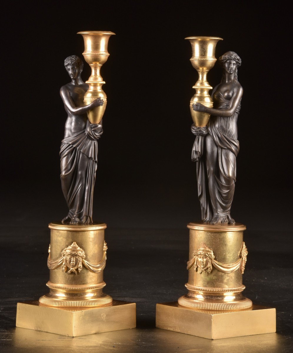 Rare paire de candélabres néoclassiques de la fin du XVIII? / début du XIX? siècle, en bronze finement ciselé à double patine brune et dorure, attribuée à Humphrey Hopper (vers 1767–1844). Les figures féminines d’inspiration antique soutiennent des binets en forme de vases, dans une élégante pose en contrapposto, typique du goût Regency. Les drapés abondants contrastent magnifiquement avec la patine sombre des figures, tandis que les éléments dorés apportent une luminosité chaleureuse. La dorure a été restaurée avec soin, redonnant tout son éclat aux parties en bronze doré dans le respect de l’esthétique d’origine. Chaque candélabre repose sur un piédouche circulaire orné de masques et de guirlandes, lui-même posé sur une base quadrangulaire. Une paire décorative et harmonieuse, représentative du bronze néoclassique à la charnière des XVIII? et XIX? siècles. Dimensions : 31 × 9 cm