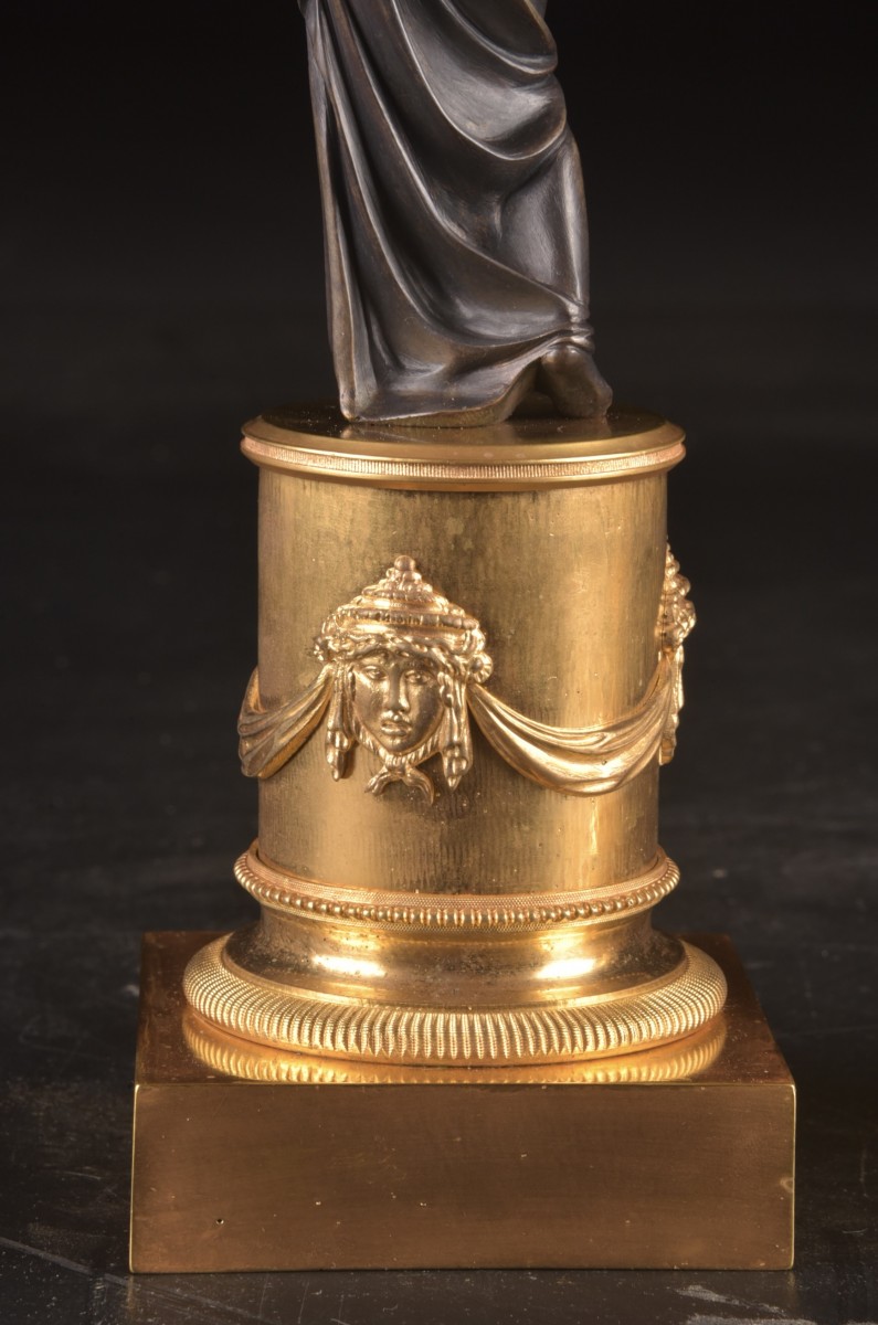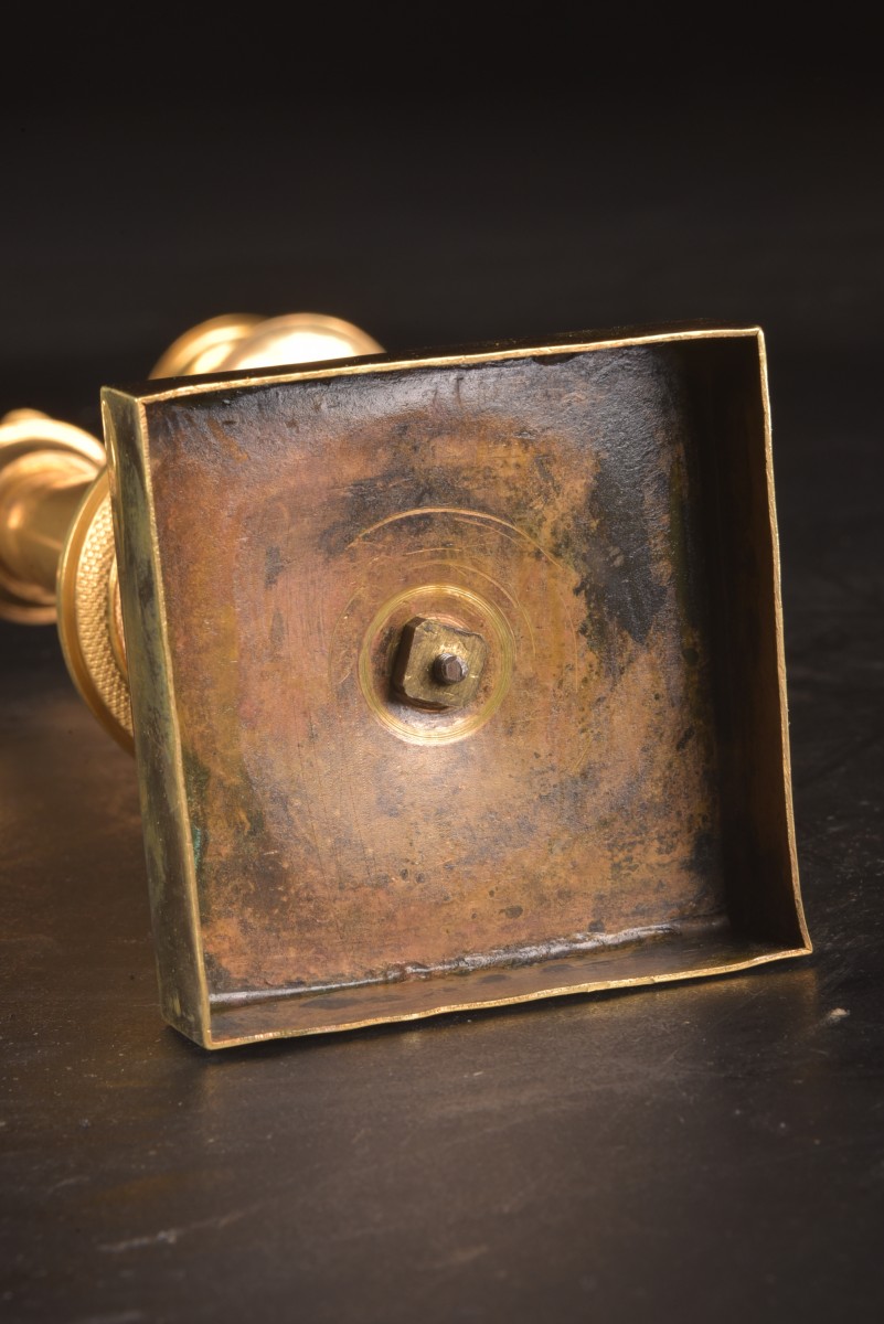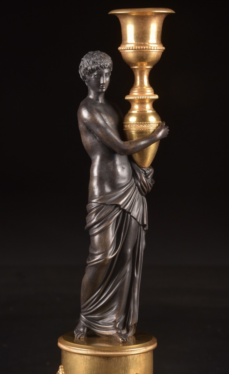 Retrouver le mobilier ou les objets d''art similaires à « Paire de candélabres néoclassiques en bronze doré et patiné » présenté par Mora Antiques, antiquaire à Bilzen dans la catégorie Bougeoirs et Chandeliers Directoire, Luminaires.