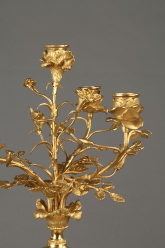 Une paire de candélabres d’époque Louis XVI en marbre blanc et bronze doré à quatre feux.
