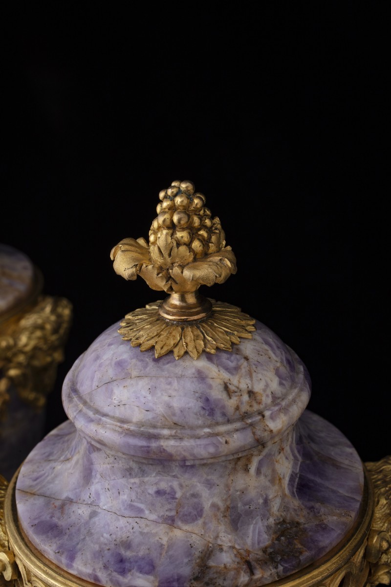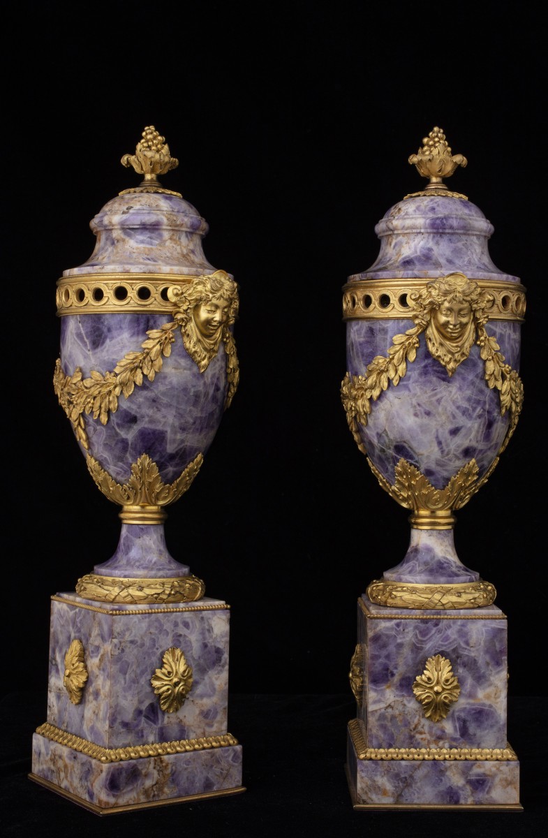 Paire exceptionnelle de cassolettes en améthyste et bronze, finement ciselées et dorées au mercure. France. Époque : Fin du XVIIIe siécle. H x L x P : 31 x 12 cm. Base : 7,5 x 7,5 cm.