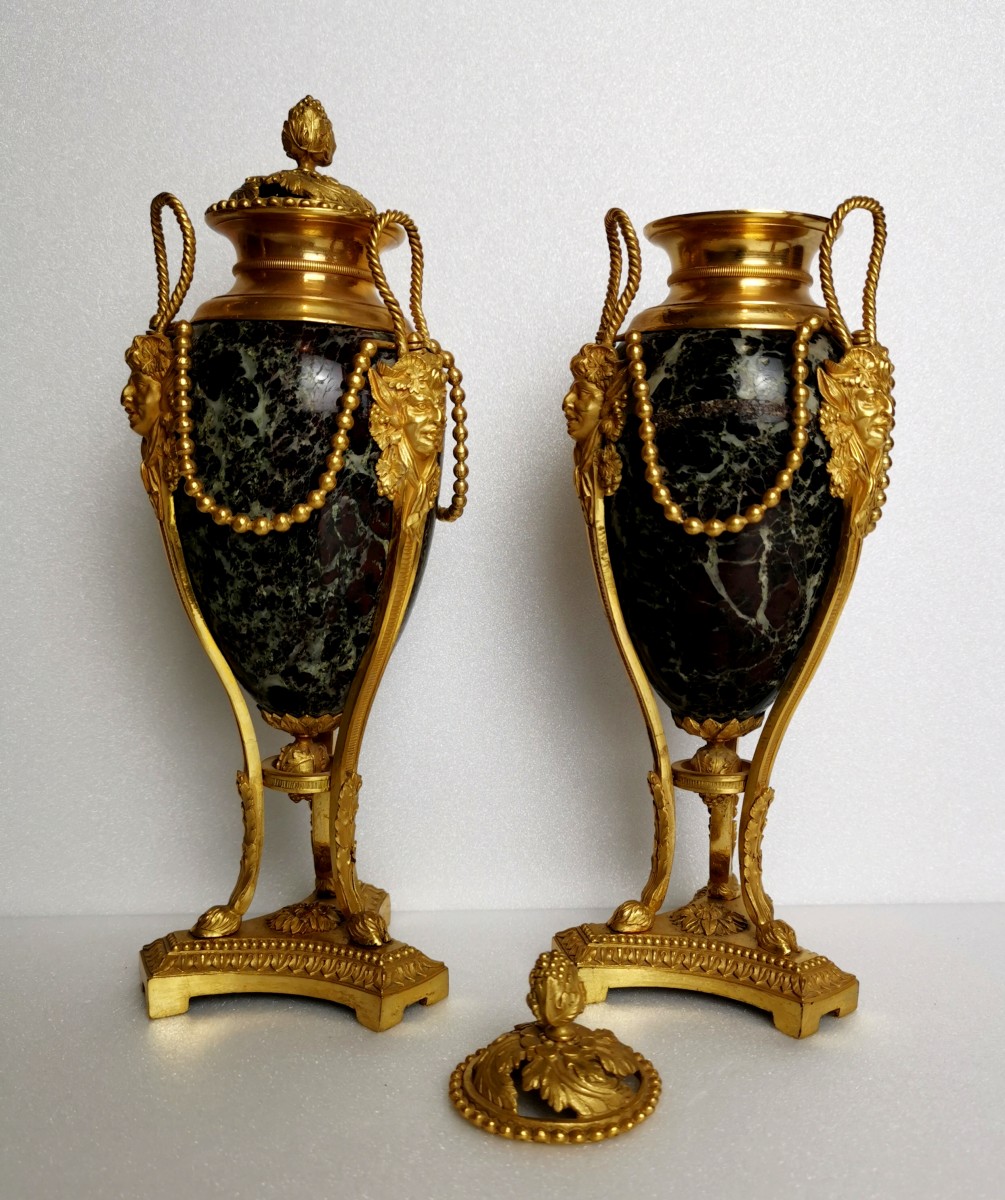 Paire de cassolettes en «athéniennes» néoclassiques en marbre vert de mer serti de bronze finement ciselé et doré à l'or mat et brillant de style Louis XVI. Ornementation inspirée de la mythologie romaine à l’effigie de Bacchus, le dieu de la vigne, du vin et de ses excès. Le corps principal est constitué d’un vase de forme ovoïde en marbre vert de mer à encolure de bronze doré cerclée d’un disque côtelé, enchâssé sur un piétement tripode. Les trois pieds sont unis en partie centrale par une bague circulaire ornée de grattoir. Chacun des pieds est remonté d’une feuille d’acanthe et ponctué de sabot de capridé. L’ensemble repose sur une terrasse triangulaire à côtés incurvés en gradins, où courent de fines rais de cœur sur rangs de perles. L’athénienne est coiffée d’un couvercle amovible ajouré, dissimulant le binet et la bobèche d’un bougeoir. Celui-ci à claire-voie est ciselé d’une spirale de feuillage de chêne et cerclé en ...