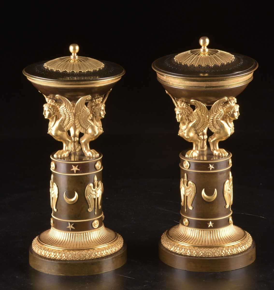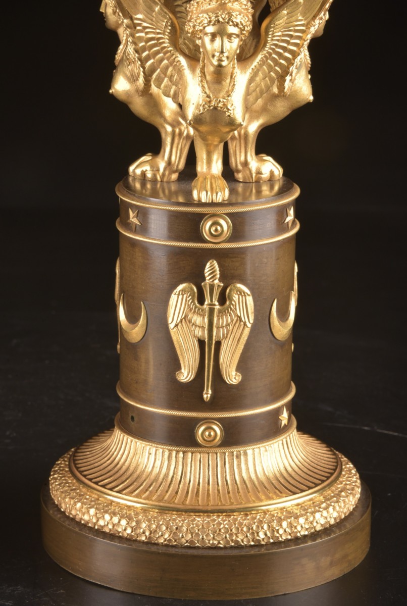 Élégante paire de cassolettes en bronze doré et patiné, d’époque Empire, début du XIXe siècle. Chaque pièce est formée d’une coupe reposant sur trois sphinx ailés finement ciselés, traités dans un vocabulaire classique d’une grande qualité d’exécution. Le fût cylindrique est orné d’appliques à décor de symboles antiques, comprenant étoiles, croissants et figures ailées, caractéristiques du goût néoclassique et égyptisant propre à l’époque Empire. La base se compose d’un socle circulaire à degrés, enrichi de frises feuillagées et d’un décor finement travaillé. L’une des cassolettes est munie d’un couvercle ajouré, indiquant une fonction d’origine de brûle-parfum. L’ensemble se distingue par l’équilibre de ses proportions, la finesse de sa ciselure et le contraste harmonieux entre bronze doré et patiné. Dimensions Hauteur : 28 cm