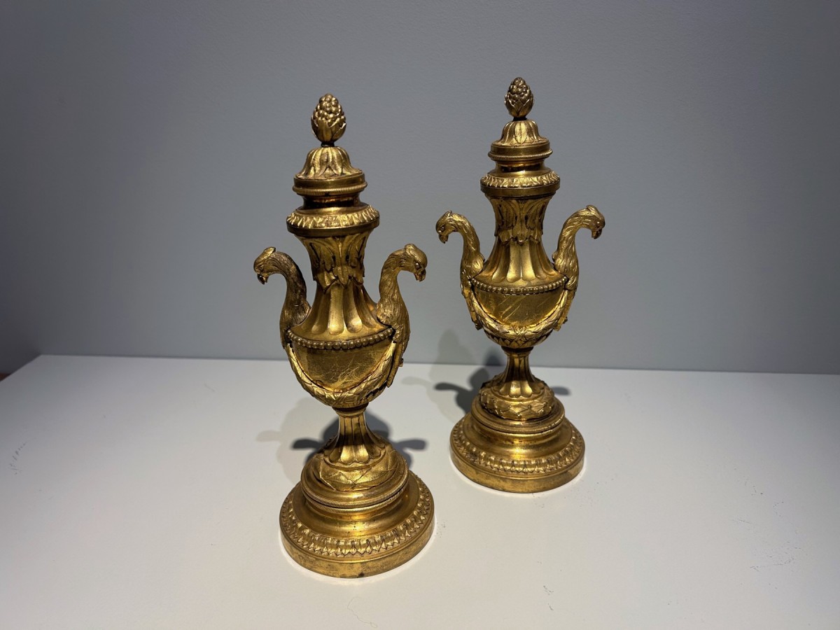 Paire de cassolettes formant bougeoir d'époque Louis XVI, en bronze ciselé doré, à décors de tête d'aigle, de rais-de-coeur et de guirlande de laurier. Travail parisien vers 1780-1785.