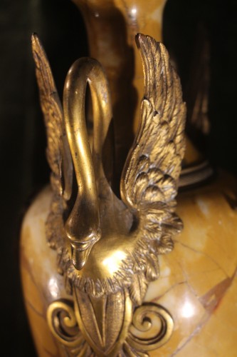Importante et belle paire de cassolettes en marbre jaune de Sienne à larges veines et bronze doré, richement ornés et ciselés. Les prises en forme de cygnes retenant une large palmette ajourée et reposant sur un pied en bronze décoré de feuilles d'acanthes, terminés par un socle en marbre de forme carré.