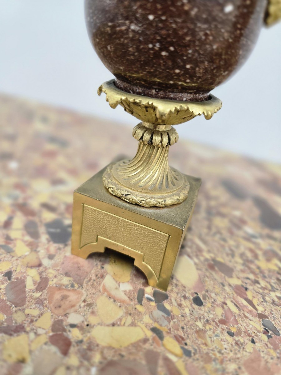 Retrouver le mobilier ou les objets d''art similaires à « Paire de cassolettes en porphyre suédois » présenté par La Jurande, antiquaire à Barlieu dans la catégorie Bougeoirs et Chandeliers Louis XVI, Luminaires.