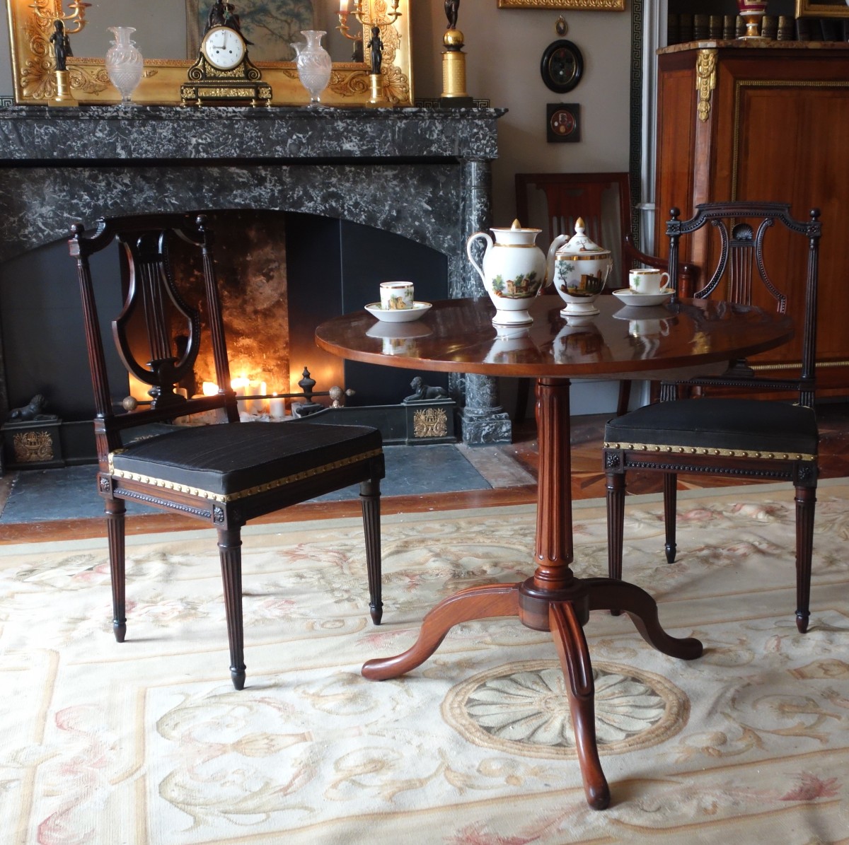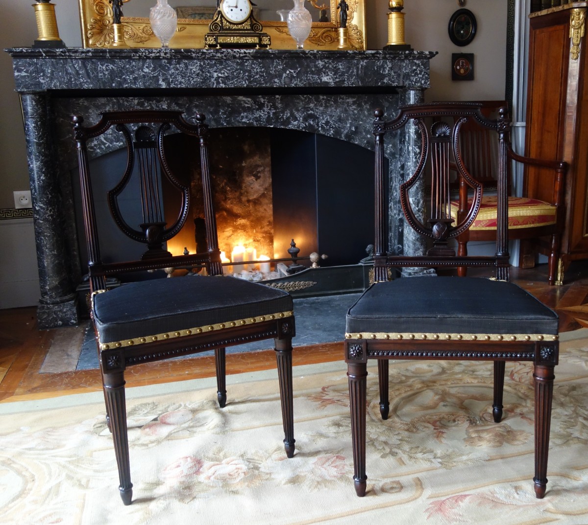 Retrouver le mobilier ou les objets d''art similaires à « Paire de chaises d'époque Louis XVI en acajou marques Palais de Compiegne » présenté par GSLR Antiques, antiquaire à Grenoble dans la catégorie Chaise Louis XVI, Sièges.