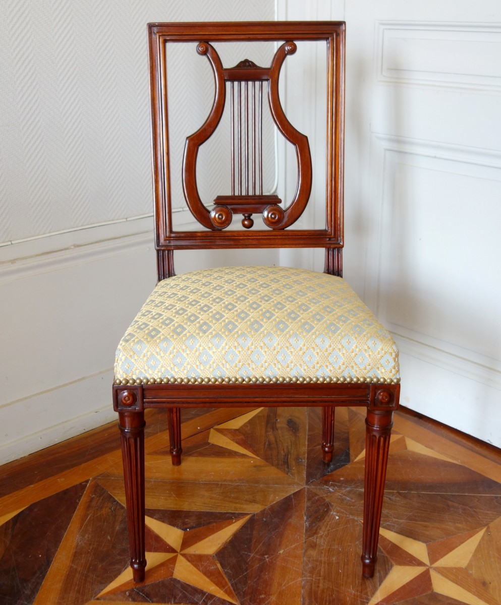 Travail d'époque Louis XVI des années 1785-90. Les chaises lyre et autres sièges en acajou à dossier ajouré sont une mode inspirée de l'anglicisme qui est arrivée en France à la toute fin de l'époque Louis XVI, juste avant la révolution.