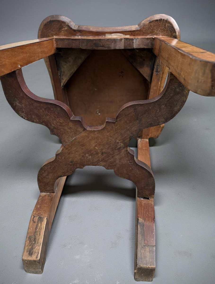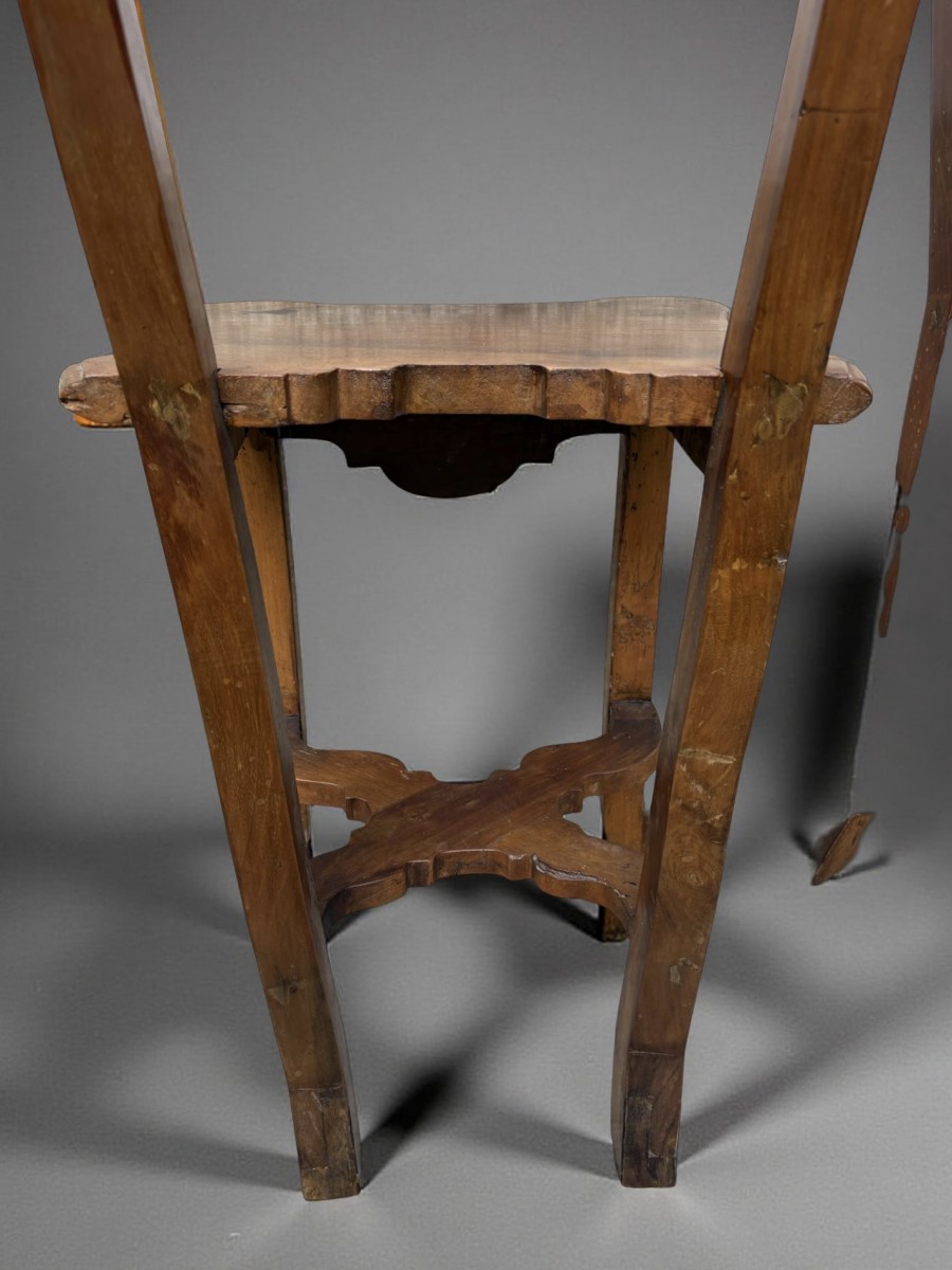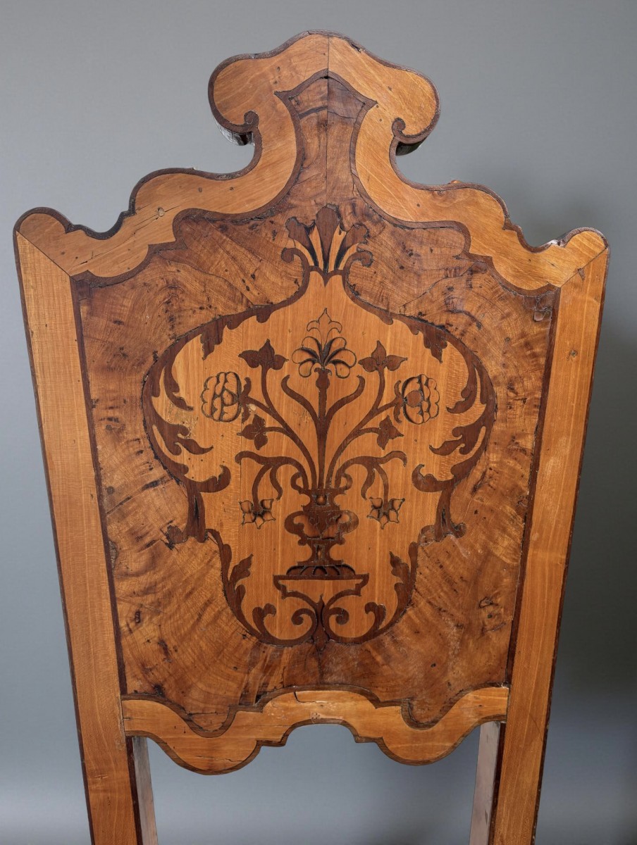 abriquées en noyer, la façade est richement incrustée de merisier et ronce d'olivier, avec un bouquet de fleurs au centre du dossier et un motif géométrique courant le long des pieds avant.