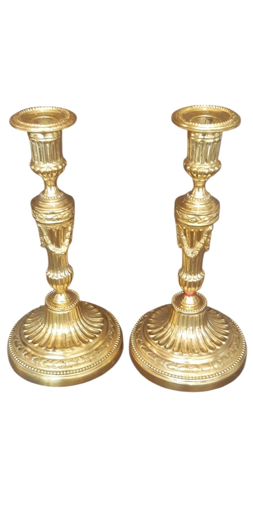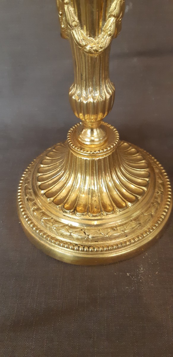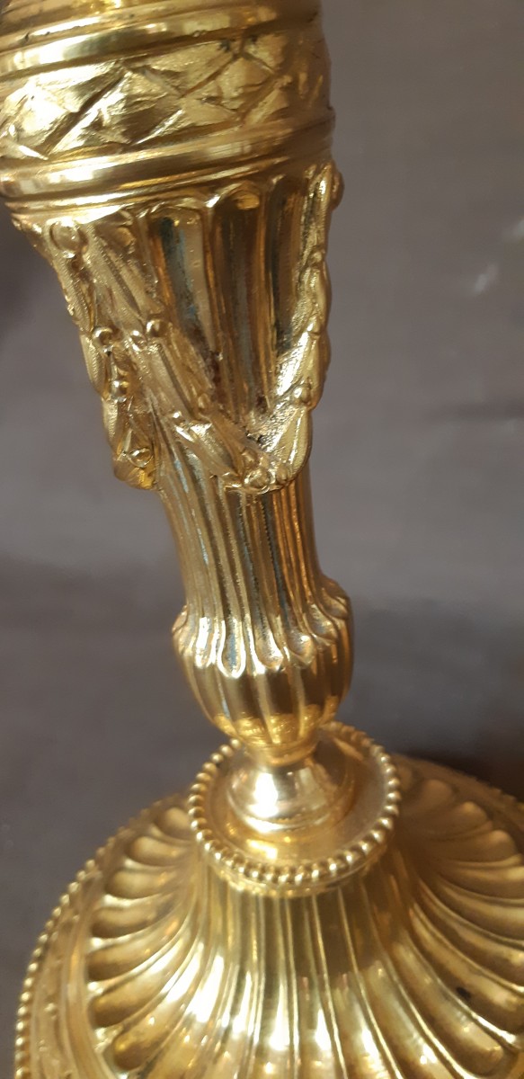 Retrouver le mobilier ou les objets d''art similaires à « Paire de chandeliers en bronze doré d'époque Louis XVI » présenté par Sylvain Rochas, antiquaire à Versailles dans la catégorie Bougeoirs et Chandeliers Louis XVI, Luminaires.
