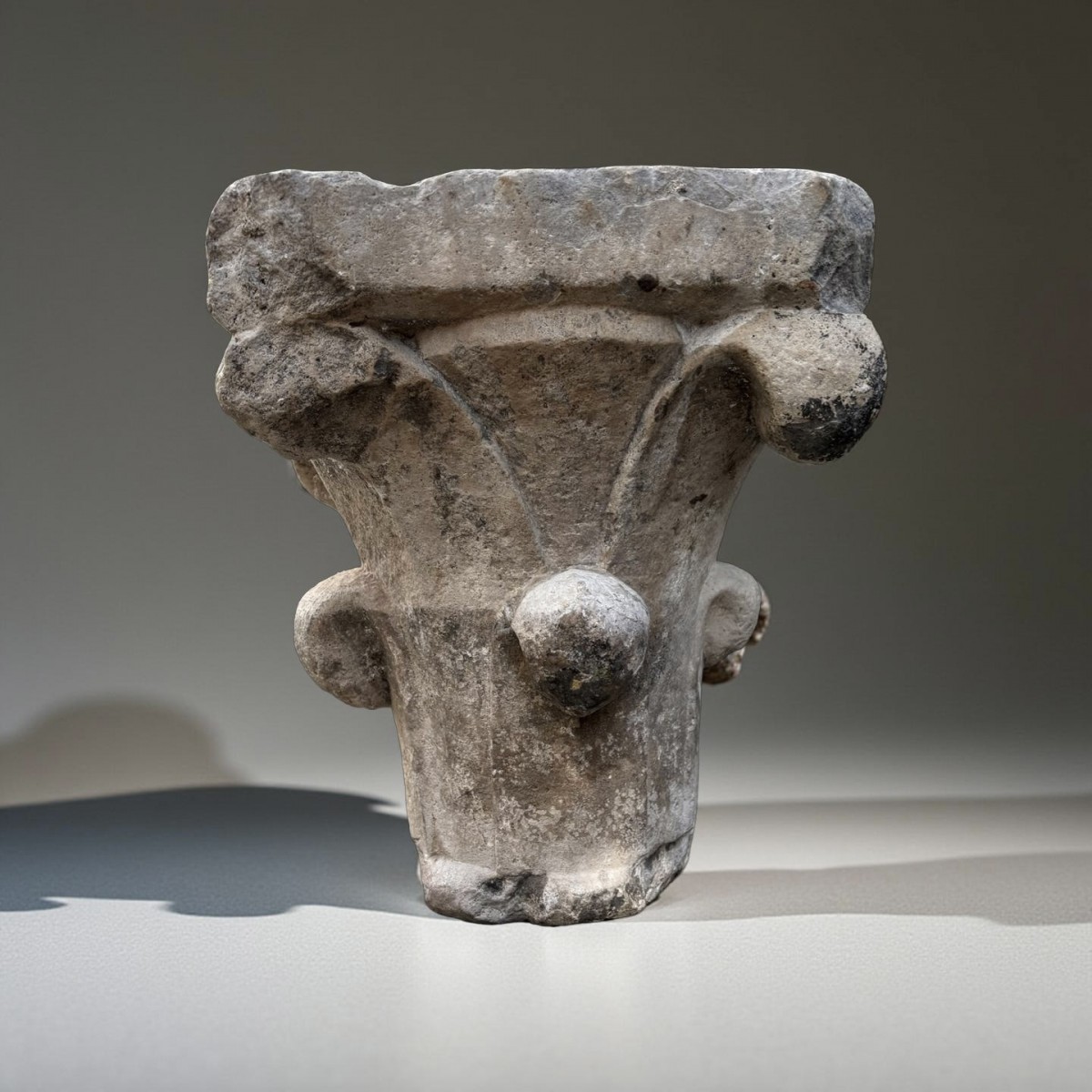 La forme élancée d'où émanent les feuilles lancéolées, surmontée d'une console épaisse, est caractéristique des chapiteaux lombards produits entre le XIe et le XIIe siècle.