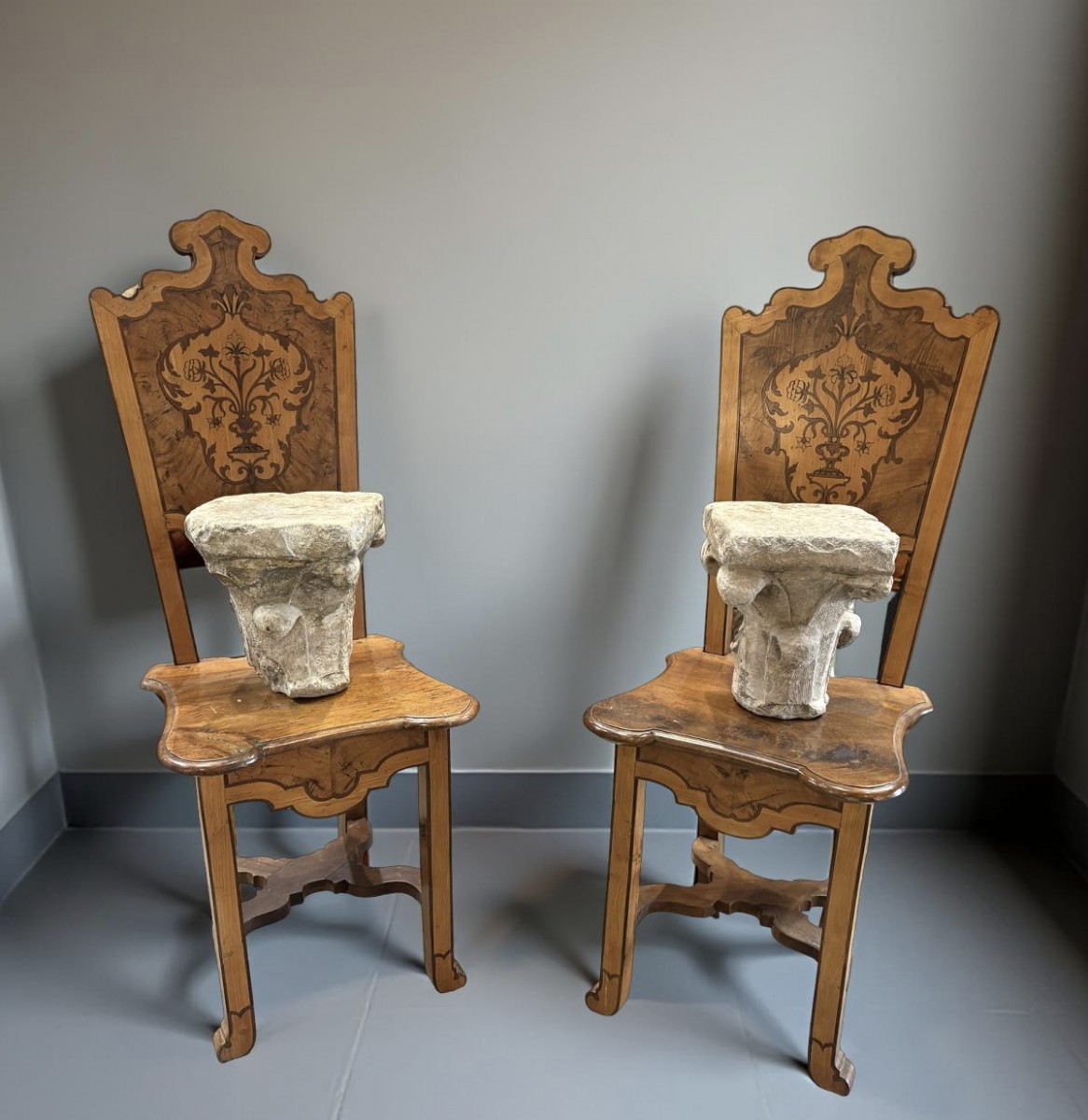 L'un des deux chapiteaux présente des parties manquantes. Ils portent des traces du temps et conservent leur patine d'origine.
