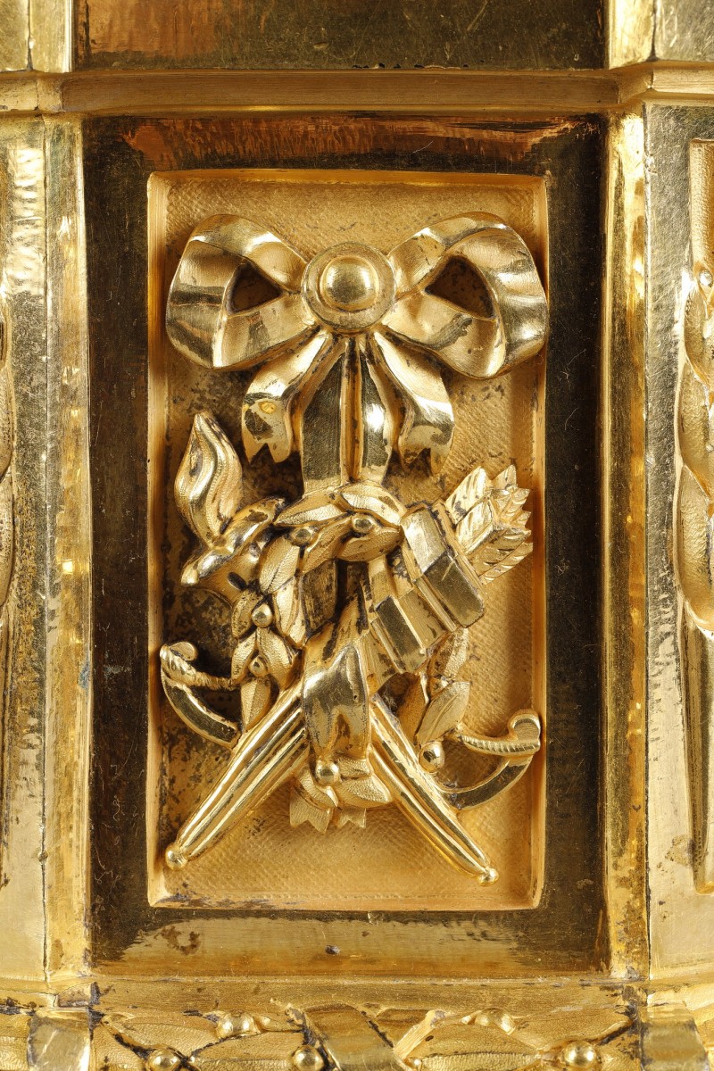 Elle repose sur une base enrichie d'une frise de lauriers perlée et surmontée d'une frise en raies de coeur sur laquelle se présente une urne à deux anses feuillagées.