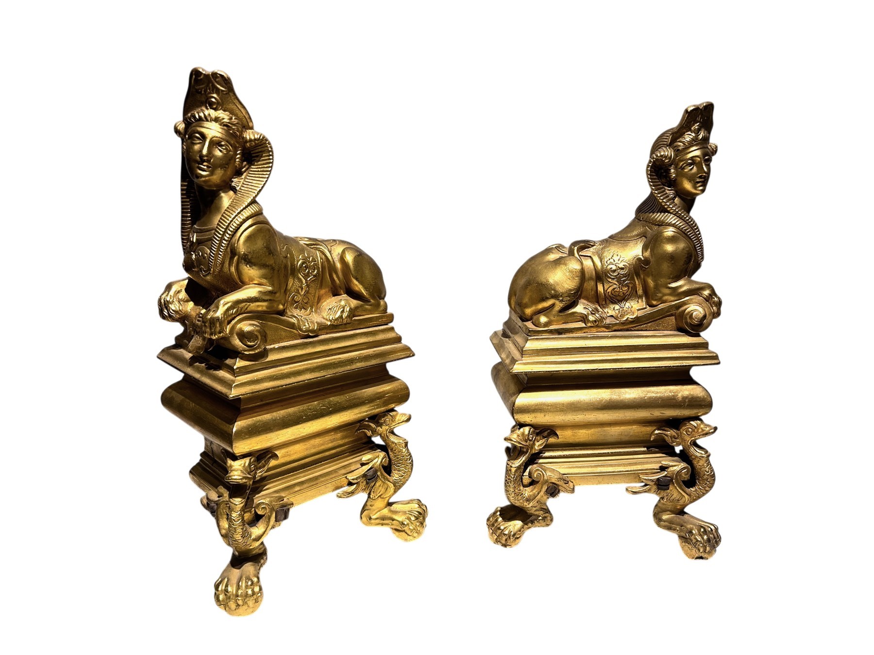 Paire de feu, en bronze ciselé dorés, représentant des sphinges soclés reposant sur des pieds griffes en forme de dragon.