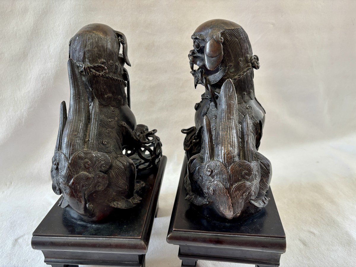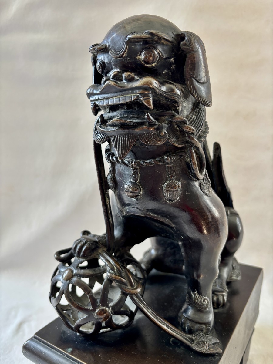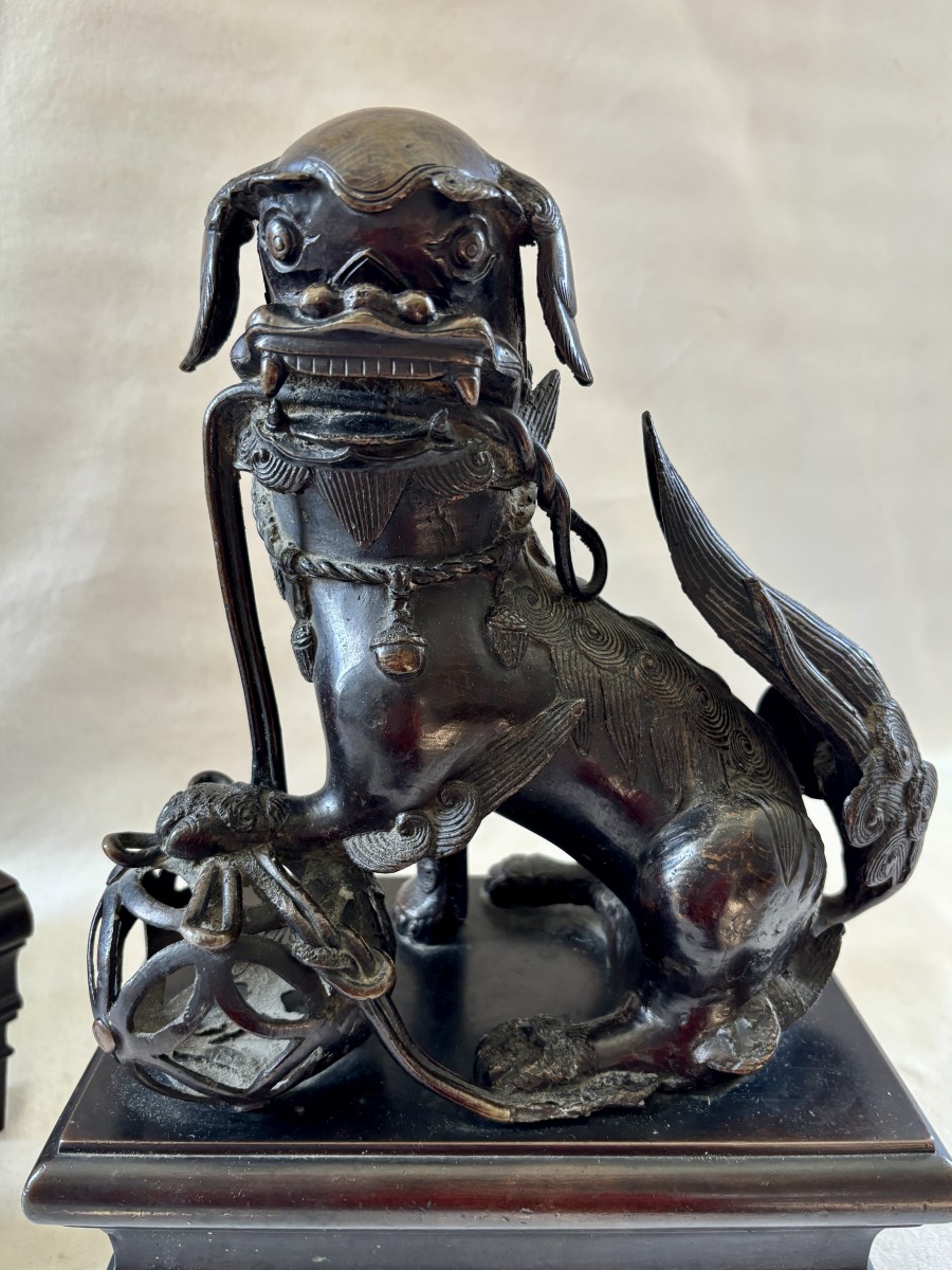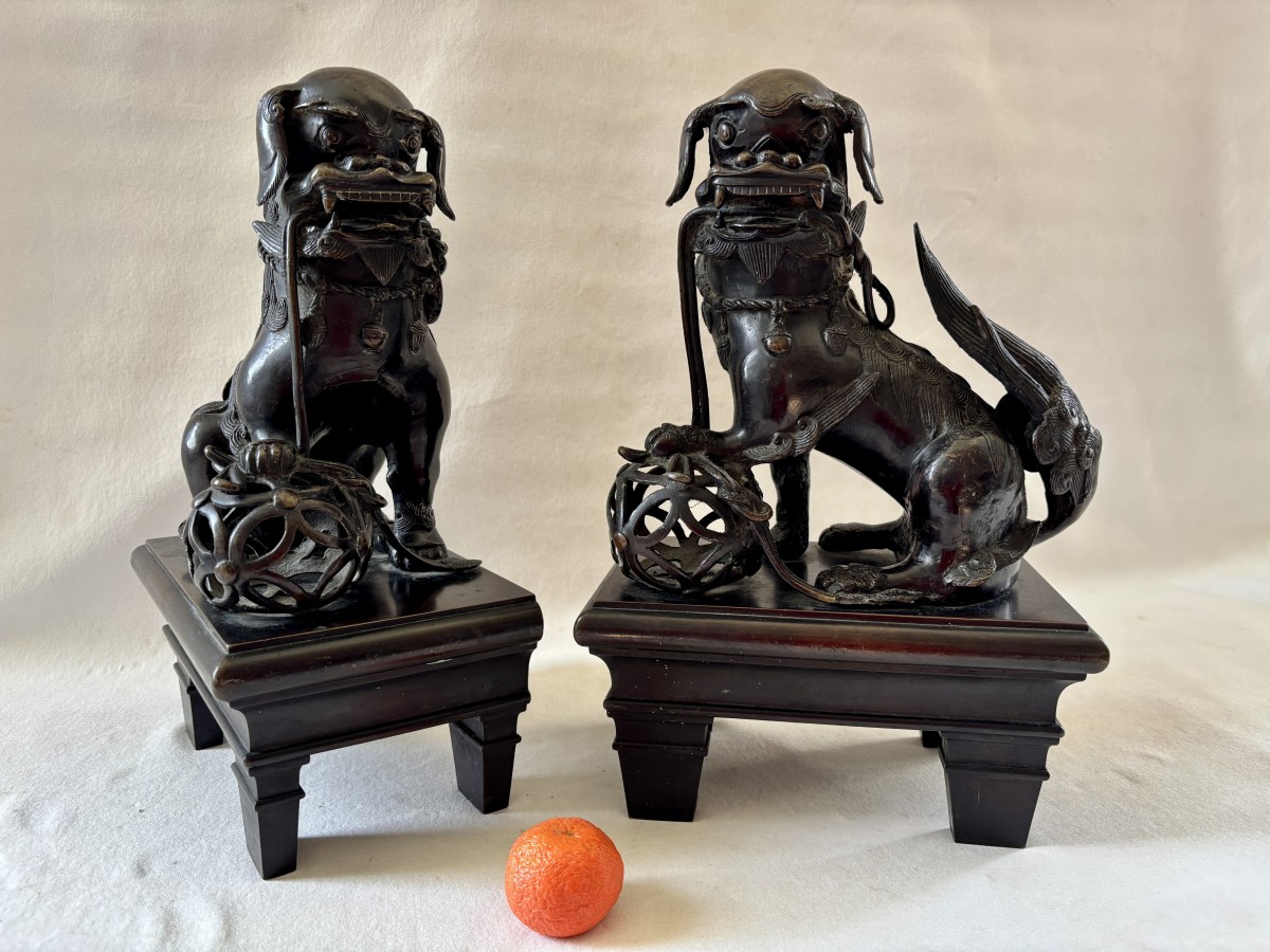 Grande paire de sculpture asiatique représentant des chiens de Fô en bronze patiné, la patte reposant sur une boule de canton ils étaient les gardiens du temple.